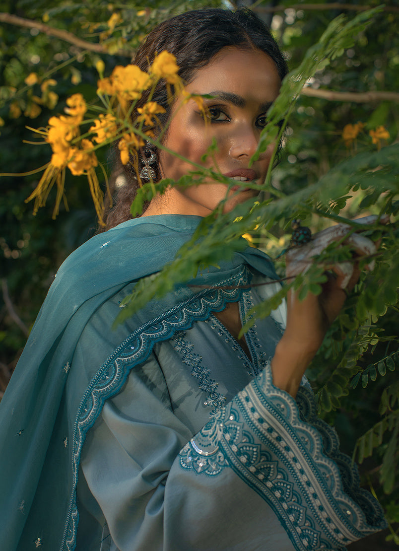 Our sea blue festive 3-piece suit is here to take your breath away. Launched as part of our flamboyant Festive Pret Collection, this particular set features the following: