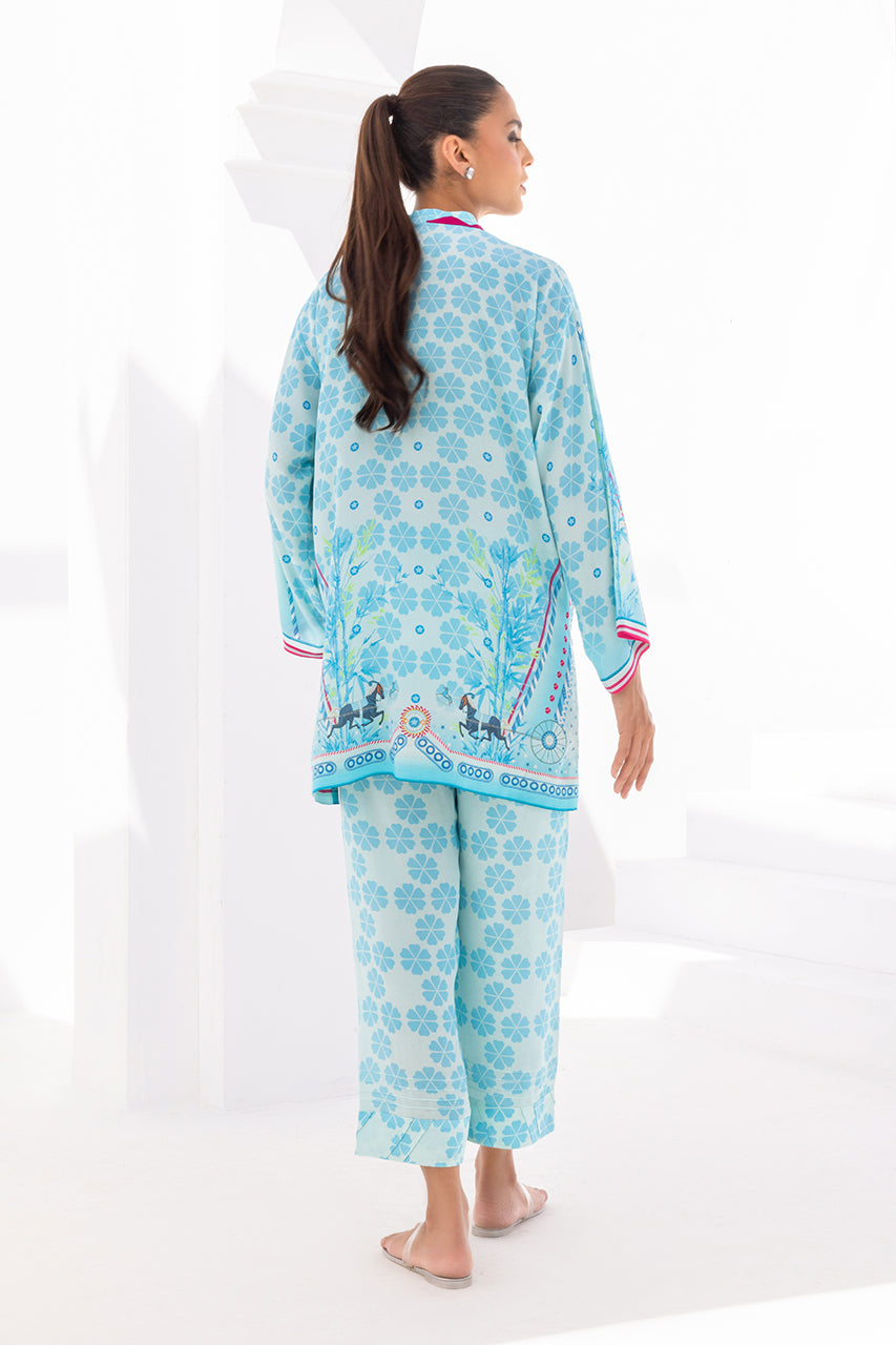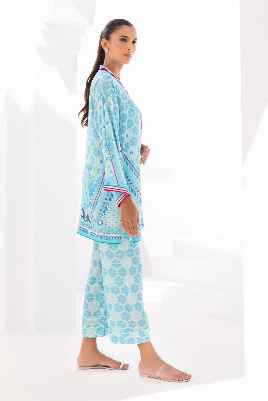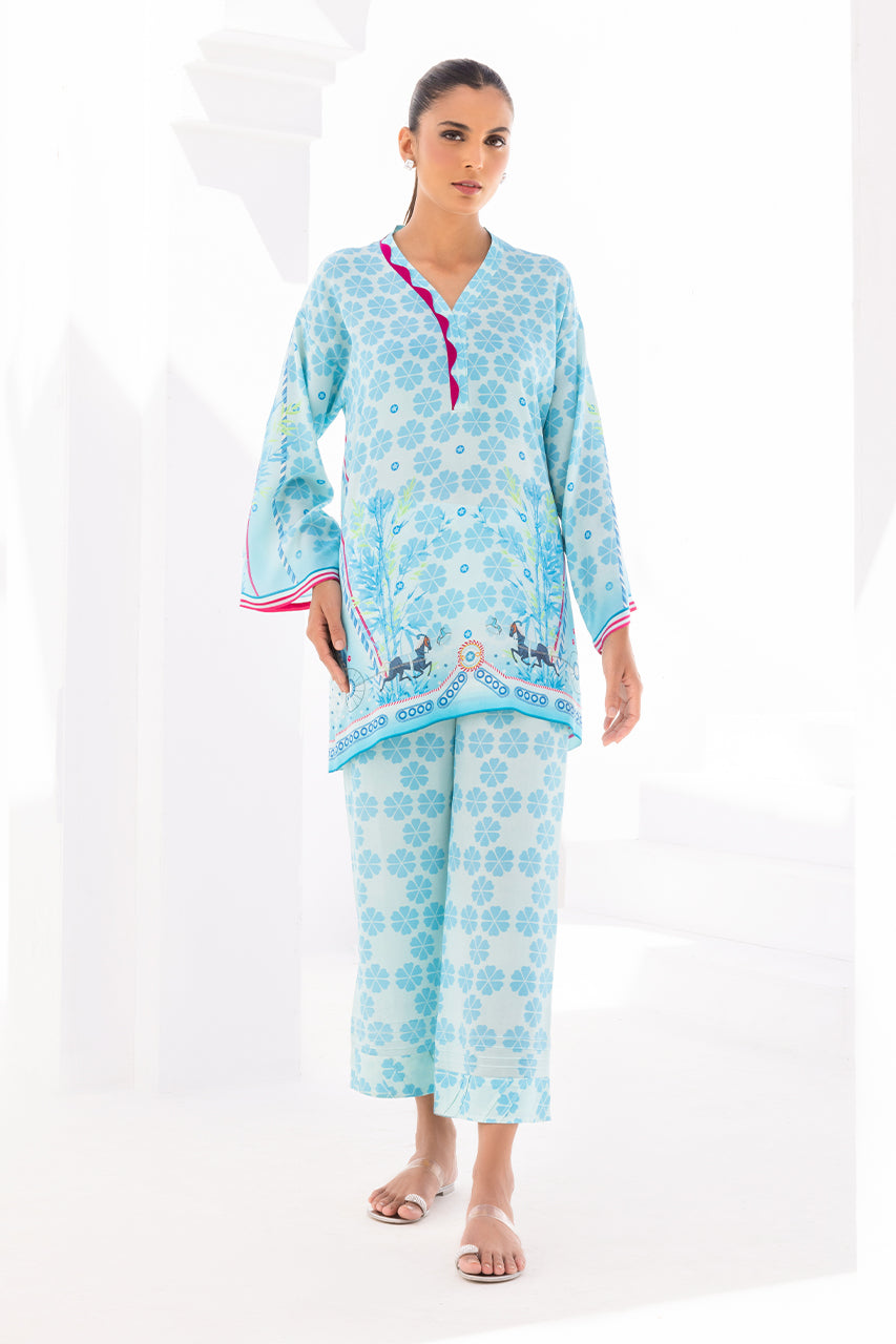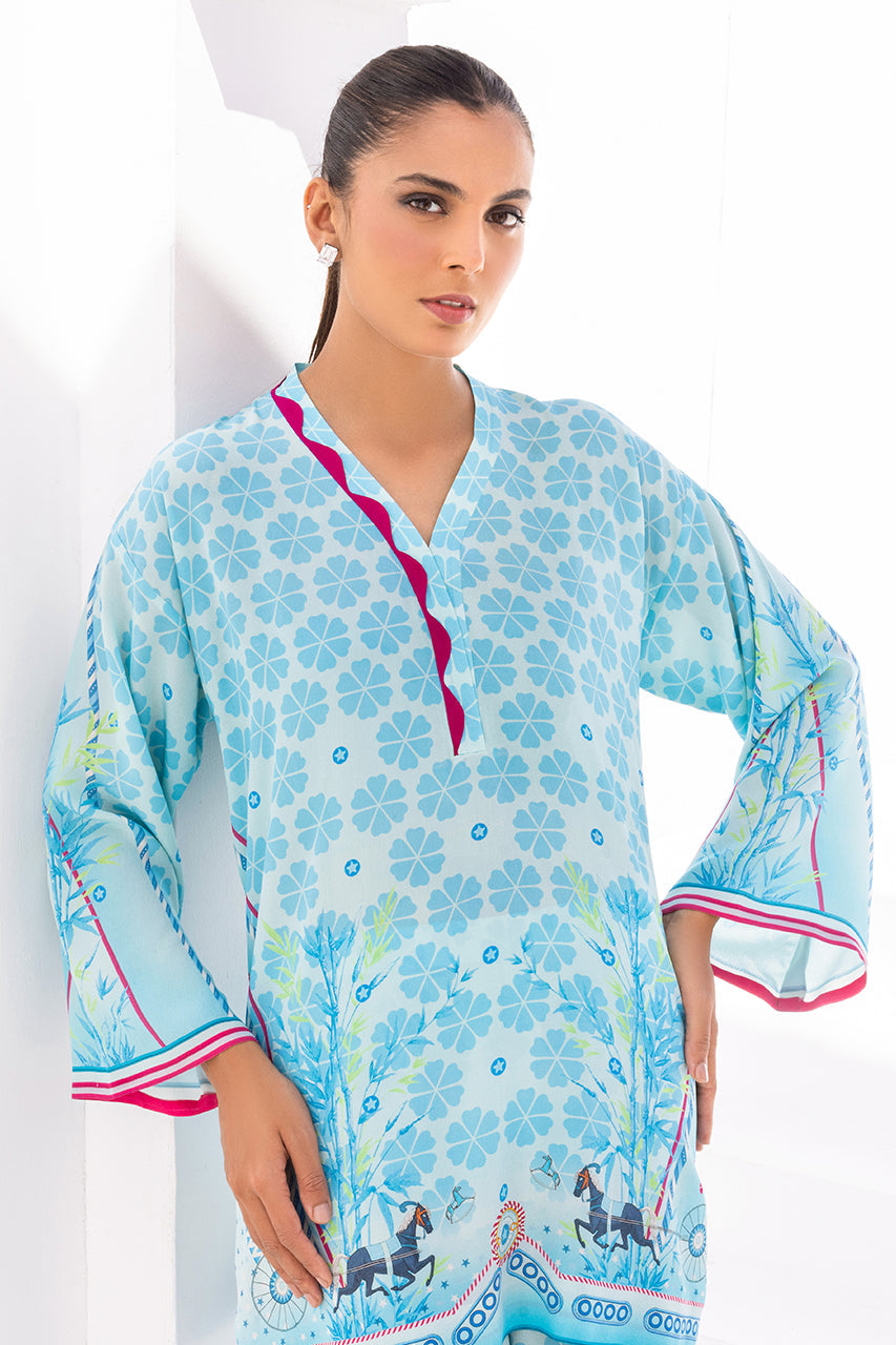 This bright color printed crepe kurta is an ode to the 80s. The geometric shapes and unique print create interest that is edgy, modern and fun. The look is completed with matching printed crepe culottes