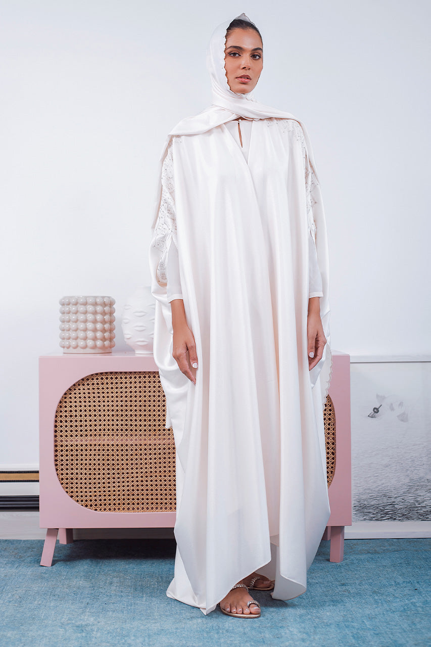 Create a chic, modest look with this abaya crafted from cream-shimmer crepe with embroidery detailing. Pair it with a matching crepe dupatta with delicate scallop edging.