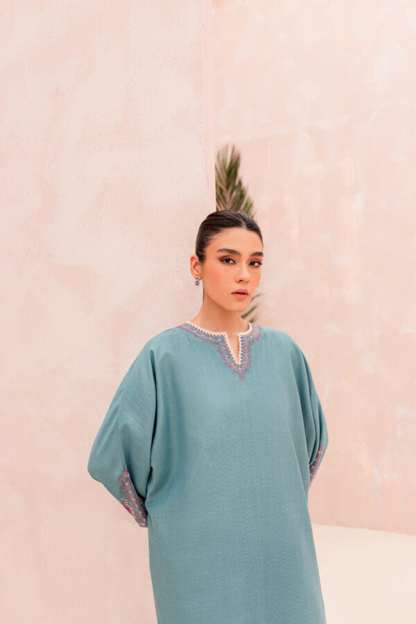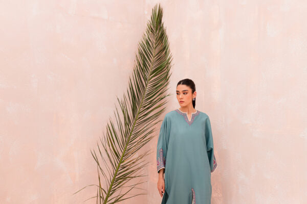 Make a statement with this delightfully detailed Kaftan, meticulously hand-embroidered in three pastel shades of pink and finished with delicate lace details on the neckline and sleeves.