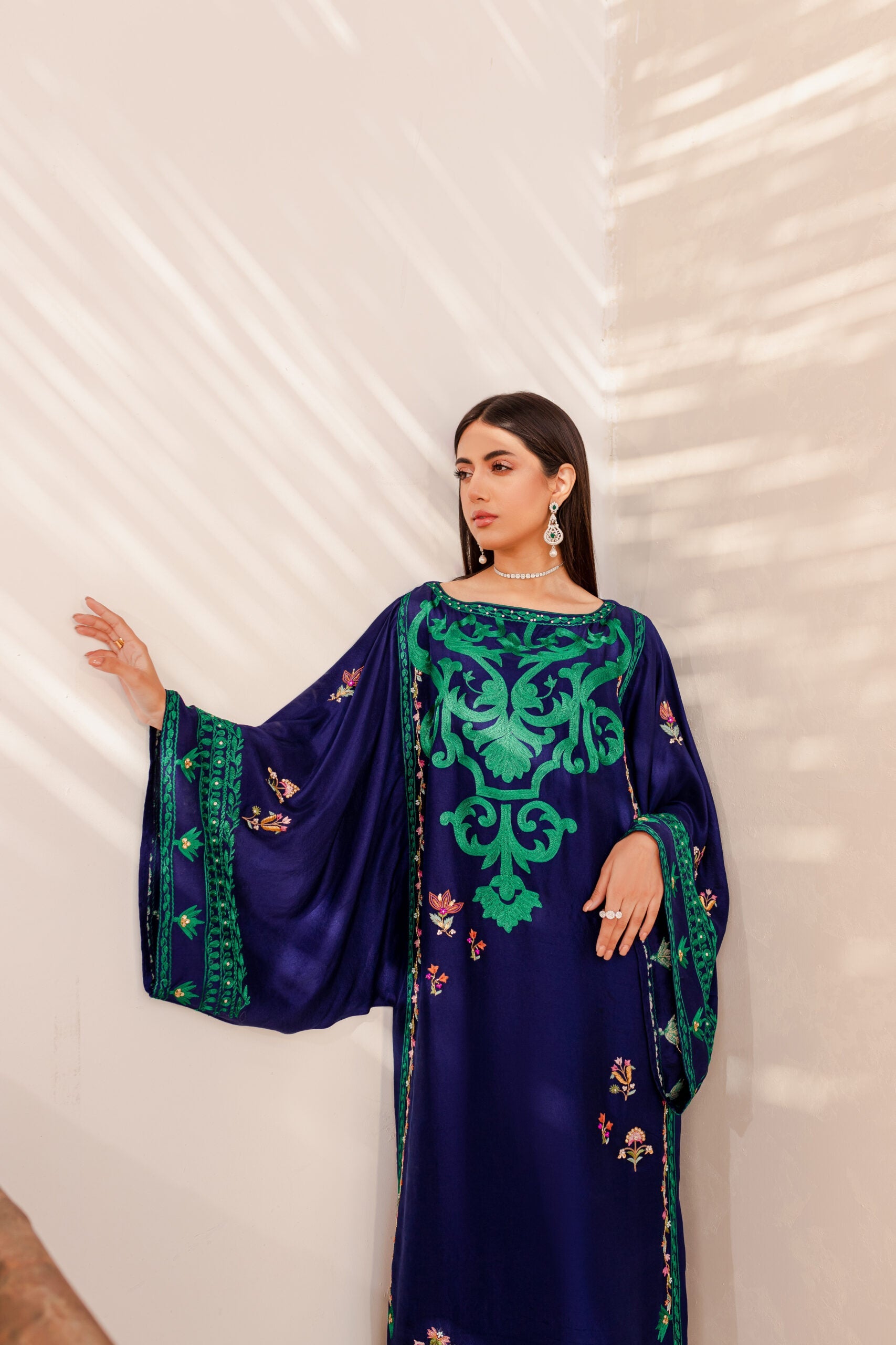 A relaxed silhouette, made from pure Raw Silk in our most loved Deep Navy, Green Ari work with multi-coloured Resham embroidered elements. Featuring Swarovski crystals and hand worked Naqshi floral motifs to add a subtle sparkle to your look. Delicate detail along the edges makes this an inevitable show stopper.