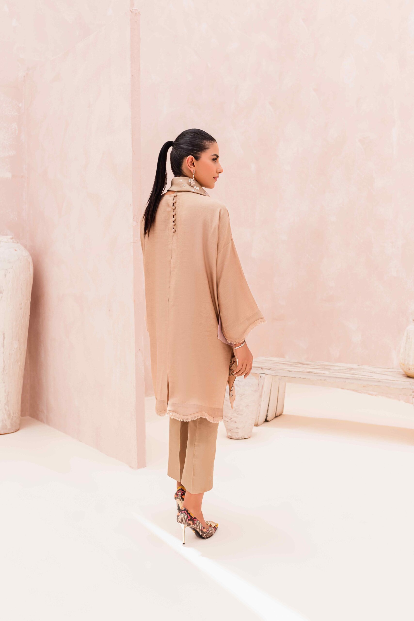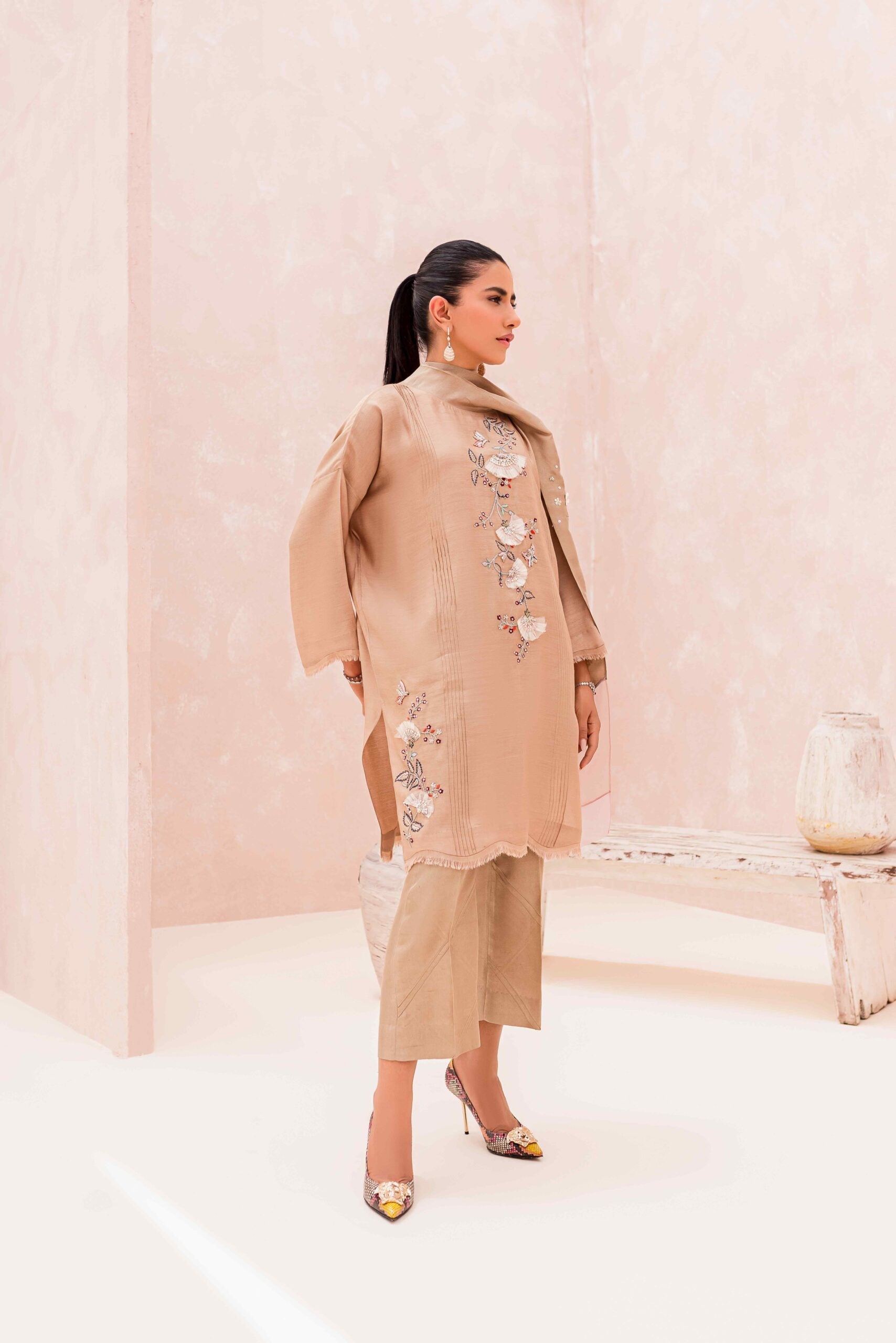An epitome of elegance, Cara features an extended shoulder cut top featuring a charming tie detail and intricate hand work of delicate floral motifs. The shirt showcases fine pintucks on the front and silk frey edging detail on the hem and sleeves. This outfit is paired with crop pants featuring delicate pintucks on the side. For that extra touch of glamour, add our dupatta adorned with crystal hand-made tassels.