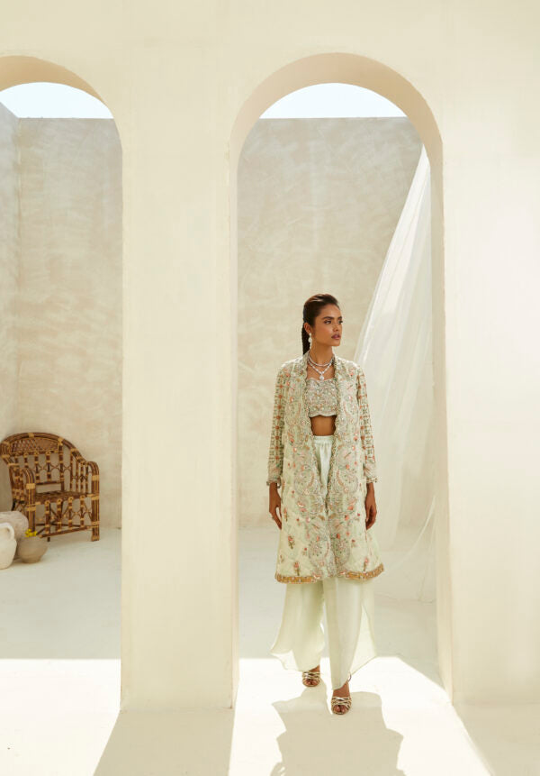 A chic front open pure Raw Silk jacket with breathtaking organza weaving on the front with patchwork, resham, mukesh and zardozi on the front, and a detailed resham and zardozi jaal on the sleeves. It is paired with a heavily embellished inner and flared pure Raw Silk pants making this ensemble both festive and elegant.