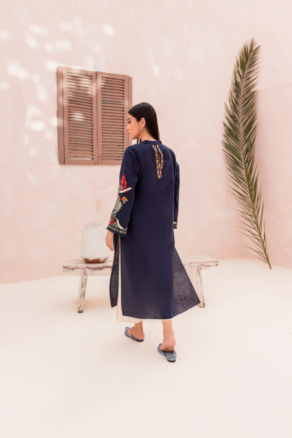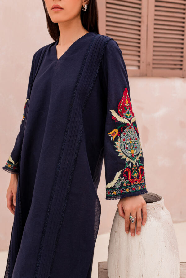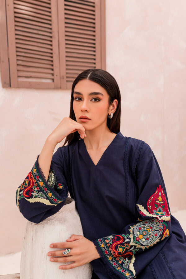 Our stunning Kiani Kurta features a V-neckline with front open detail and delicate pintucks with lace insert on front. It is adorned with our classic applique embroidery on sleeves. The back features a tasteful slit and embroidery detail on the yoke, making this kurta both stylish and comfortable for any occasion.