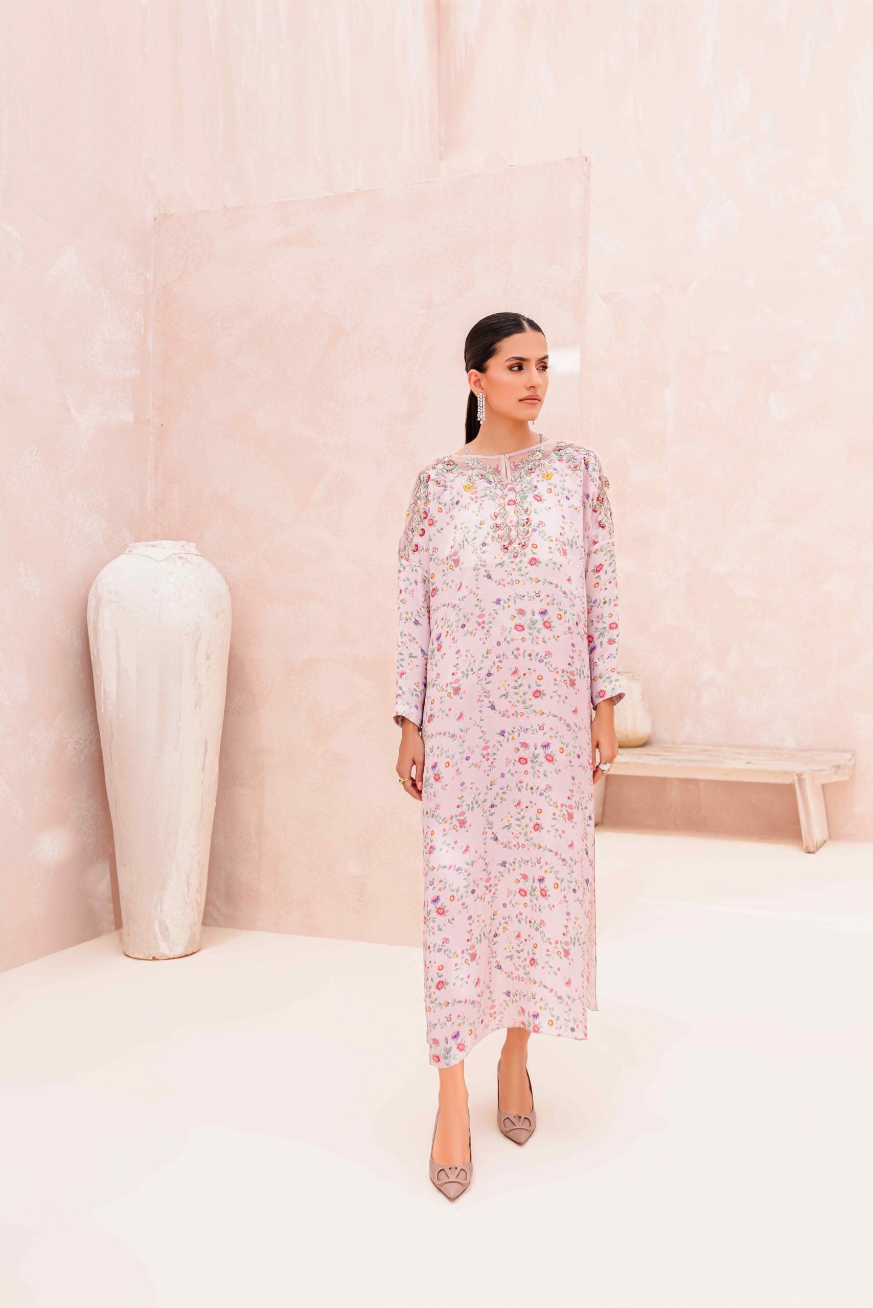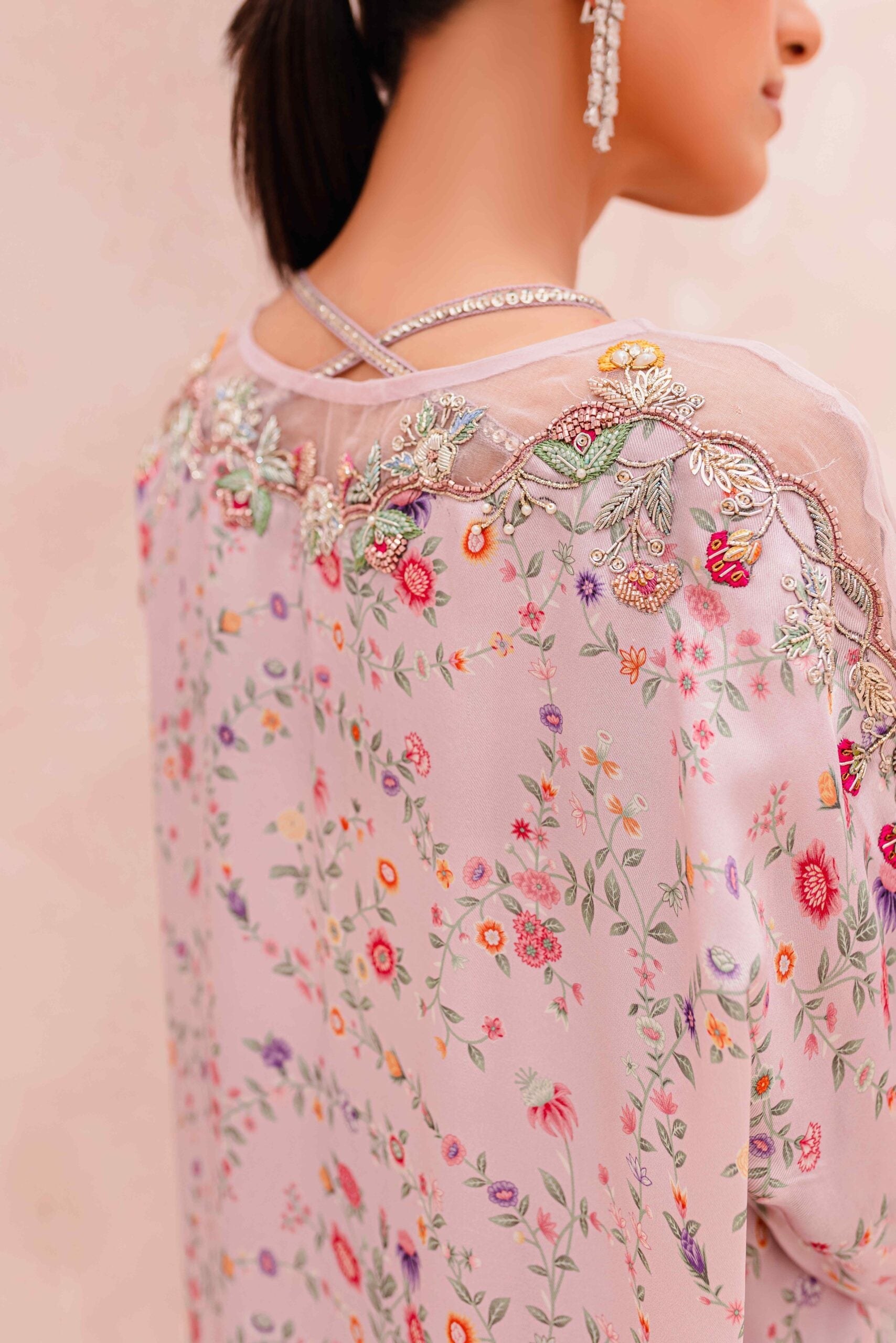 Indulge in the exquisite charm of our printed floral pure Raw Silk ensemble, adorned with intricate hand embellishments of resham and fine cut dana. The neckline showcases stunning zardozi work on the front and back, while Swarovski straps add an extra touch of elegance. Paired with solid side slit pants featuring loop details, this ensemble is a perfect combination of grace and contemporary style.