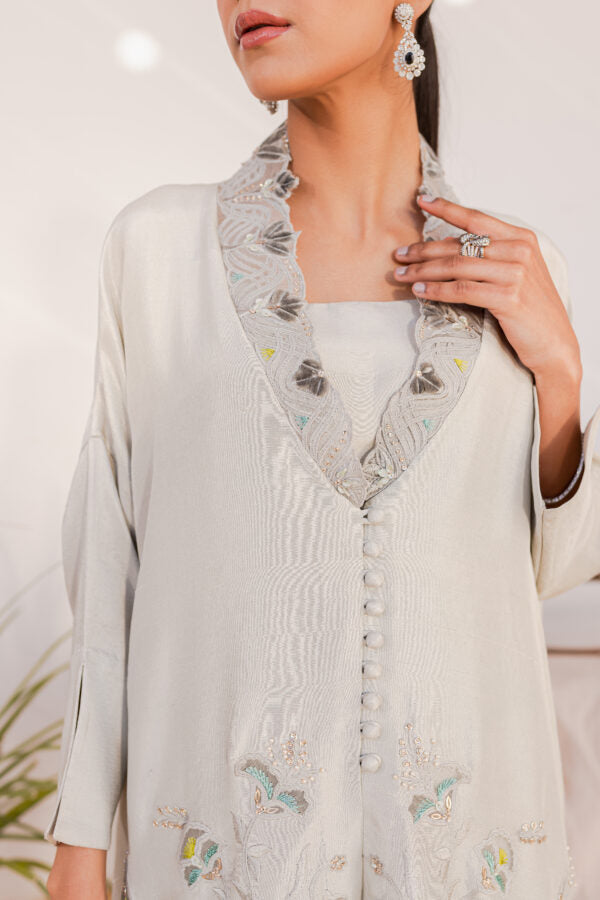Laira is the perfect pastel tunic, cut from sumptuous Raw Silk with Organza patchwork. The relaxed silhouette has a collared neckline and is adorned with delicate hand-made floral motifs, pearls, sequins and hand embroidery. Pair yours with our matching embroidered detailed skinny Raw Silk shalwar.