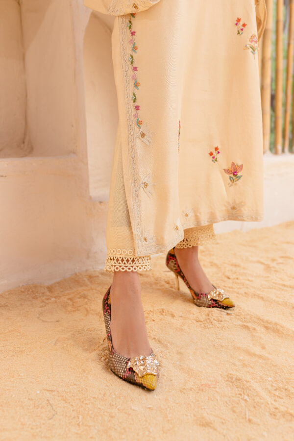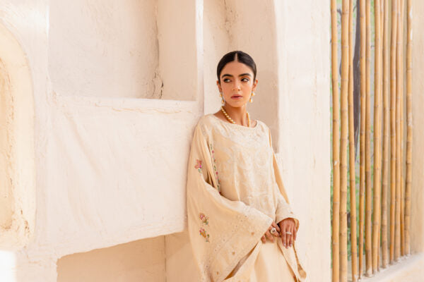 A relaxed silhouette, made from pure Raw Silk in our most loved Beige and Ivory Ari work with multi-coloured Resham embroidered elements. Featuring Swarovski crystals and hand worked Naqshi floral motifs to add a subtle sparkle to your look. Delicate detail along the edges makes this an inevitable show stopper.