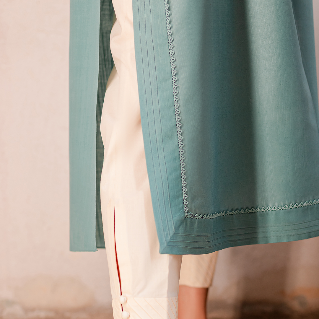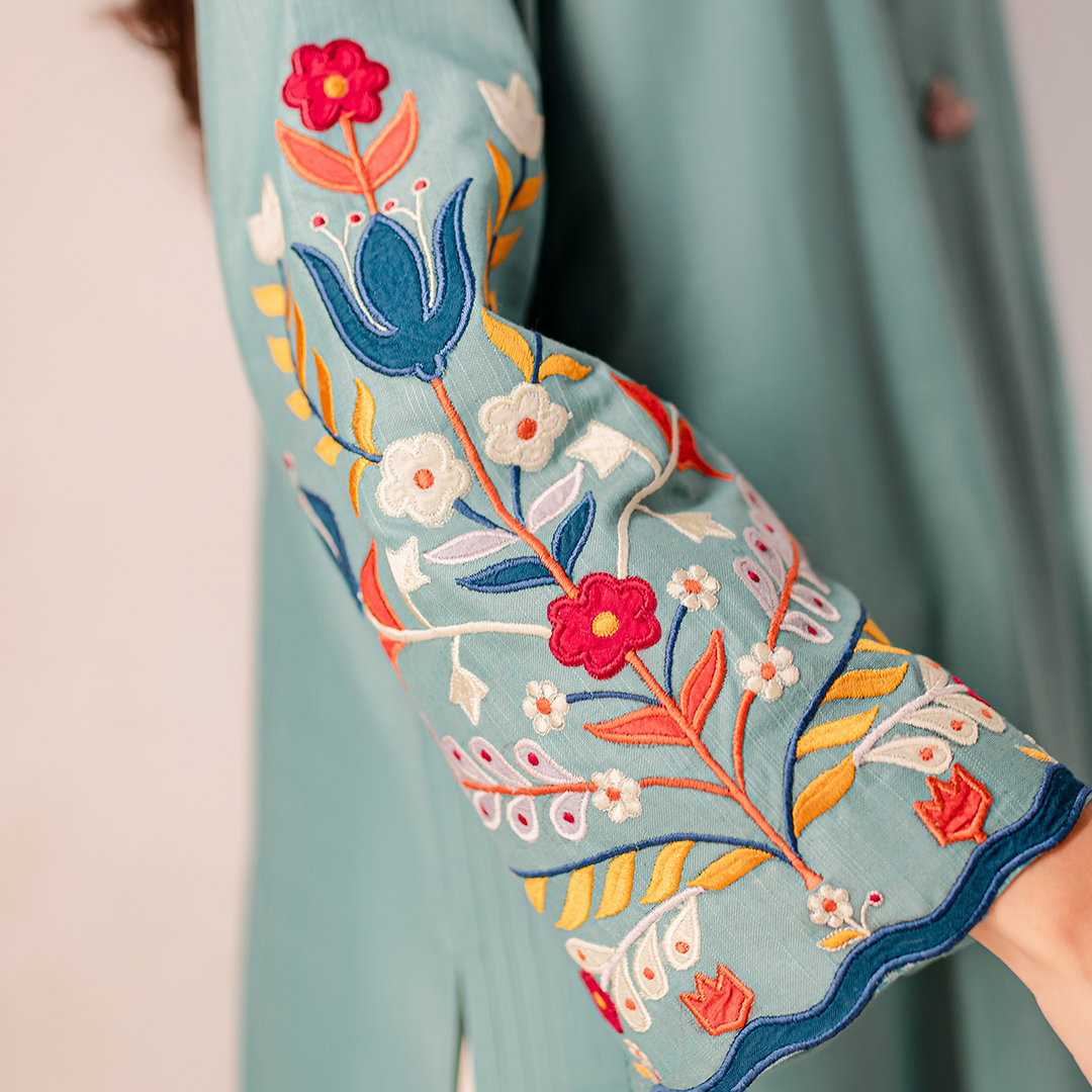 This pastel blue kurta is beautiful for a day-time affair with delicate handembroidery over the sleeves in contrasting blues, mustards, whites and complimenting pinks. It has detailing on the neckline and has a front slit. The look is completed with off-white tapered pants. Lead Time: 15 days from the time of purchase. A representative will get in touch for details upon order.