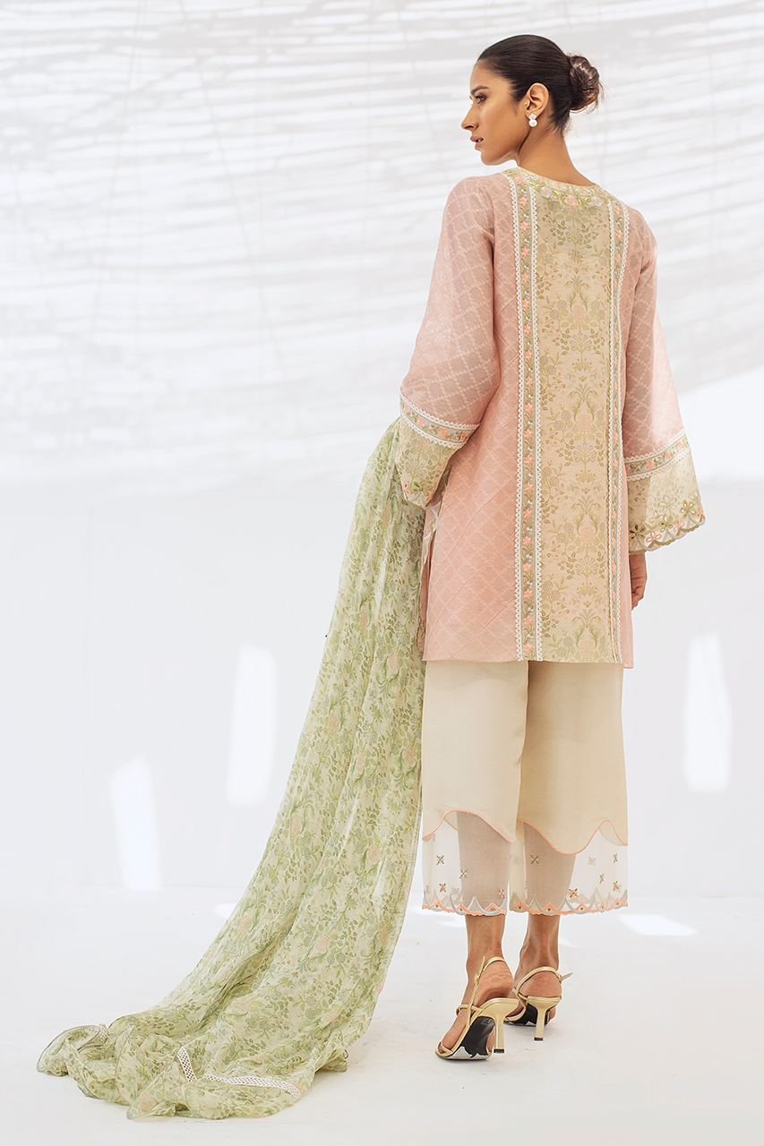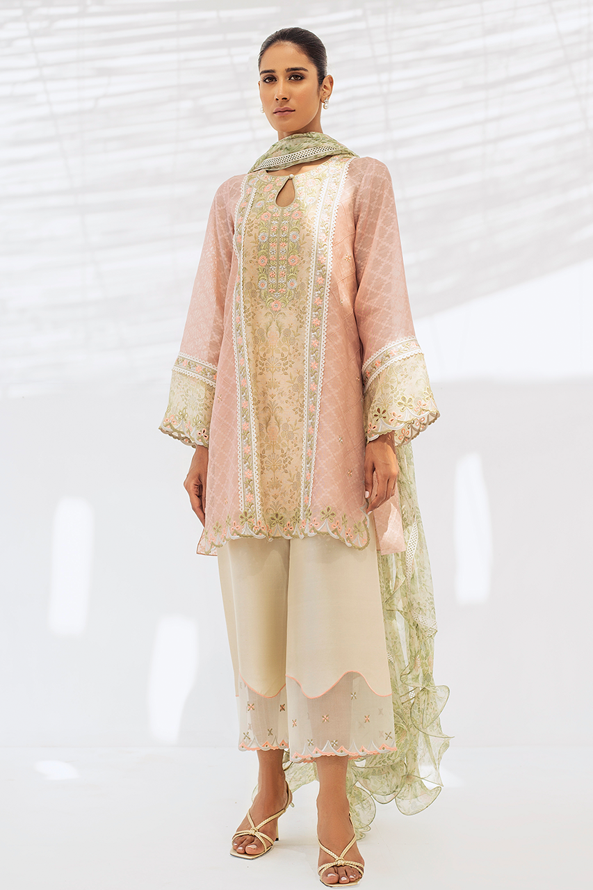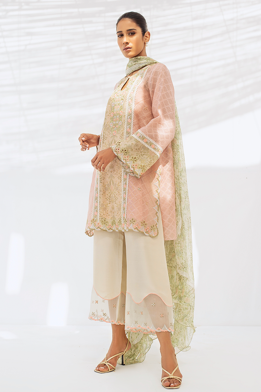 Spring into summer in this contrasting printed chai pink and mint cotton net kurta with lace, embroidery and scalloped detailing along the sleeves and hemline. Style it with a chiffon mint printed ruffled dupatta and raw silk izaars with an organza insert.