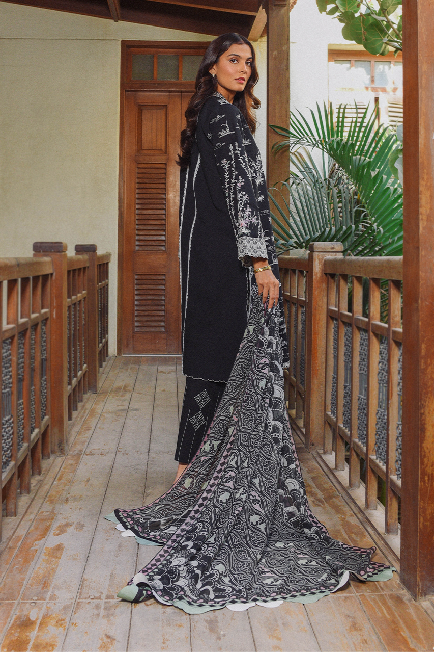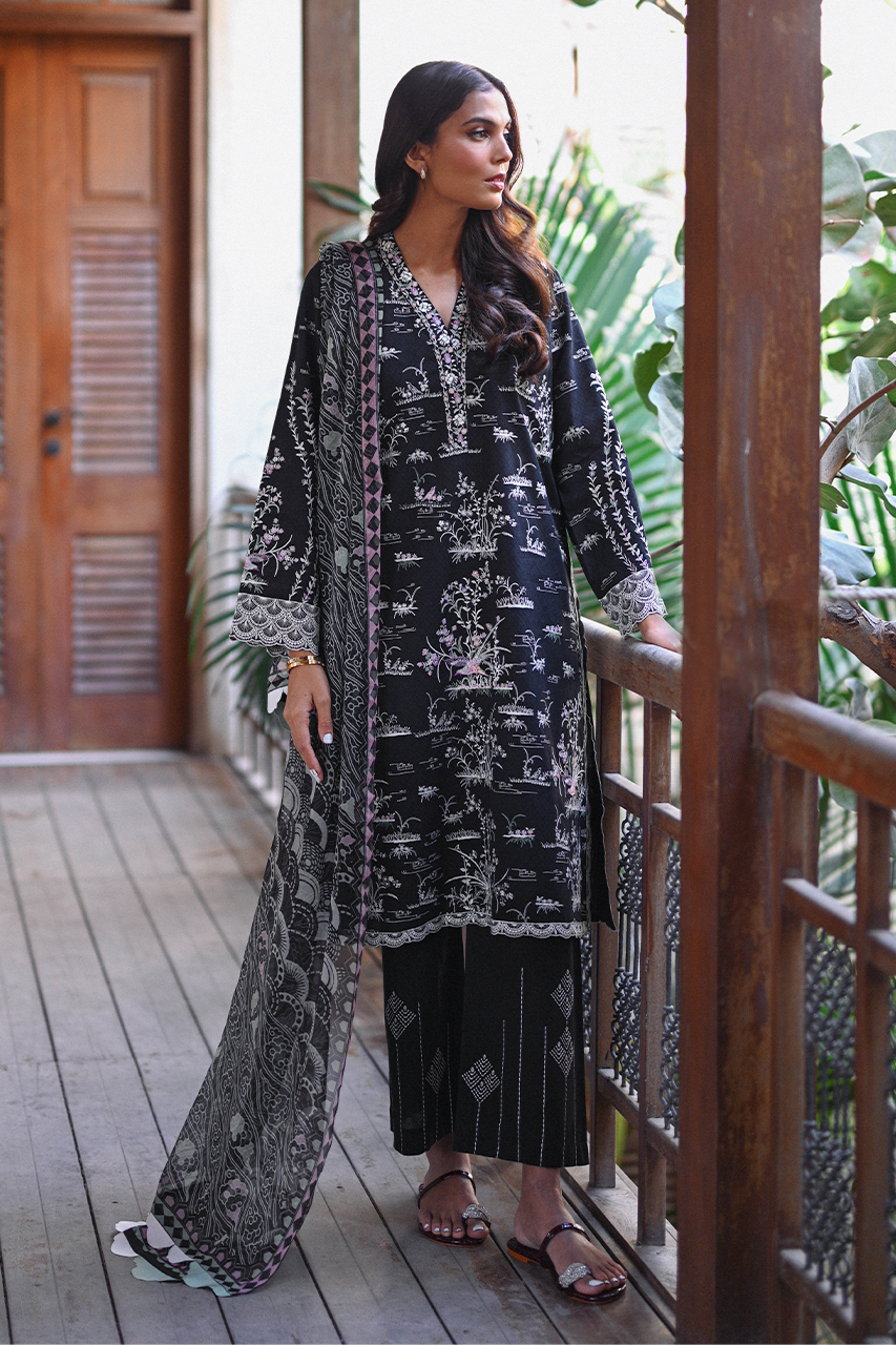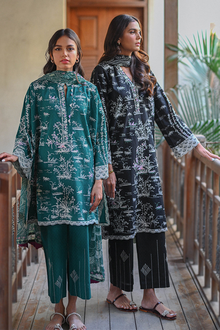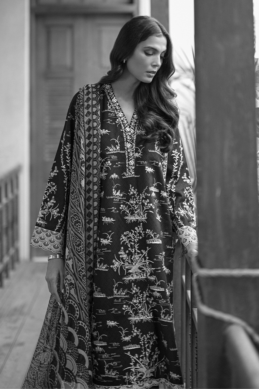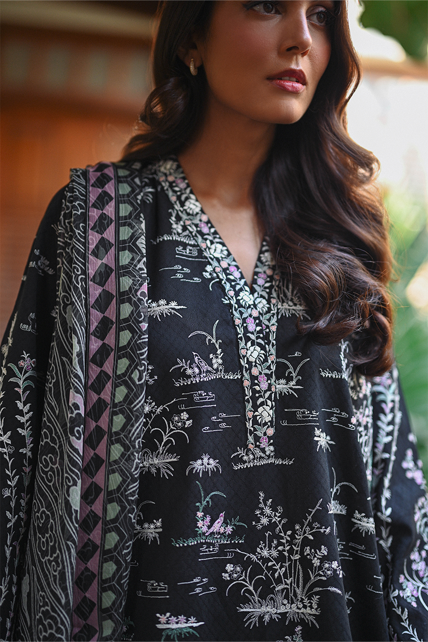 A charcoal shade on jacquard lawn is rendered with ivory-coloured embroidery with hints of lilac and sage in chinoiserie imagery. Scallop border details frame the sleeves, neckline and boarders. A matching teal chiffon dupatta features a geometric cloud print. Paired with embroidered geometric kantha detailed trousers on a base of jacquard lawn completes the look.