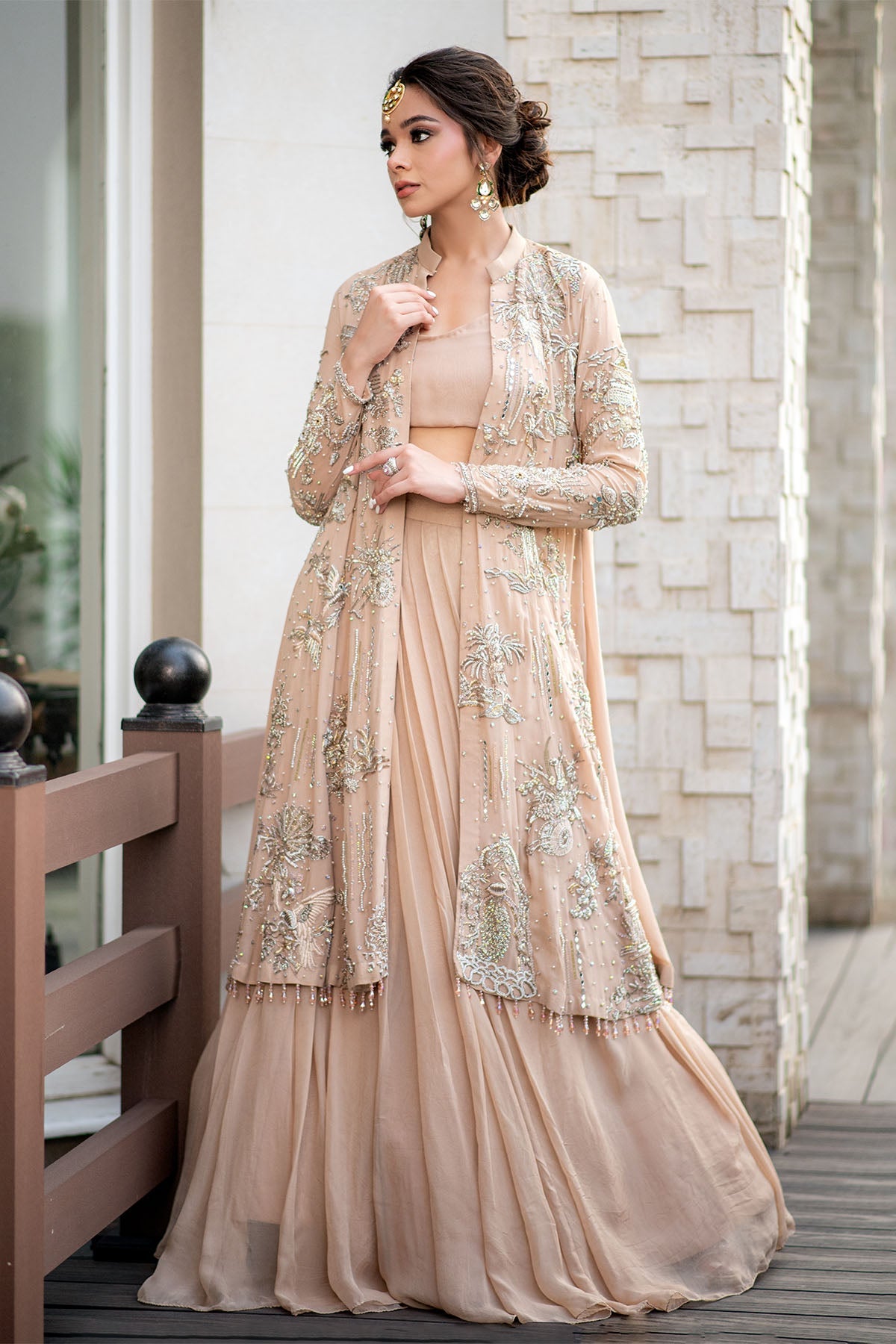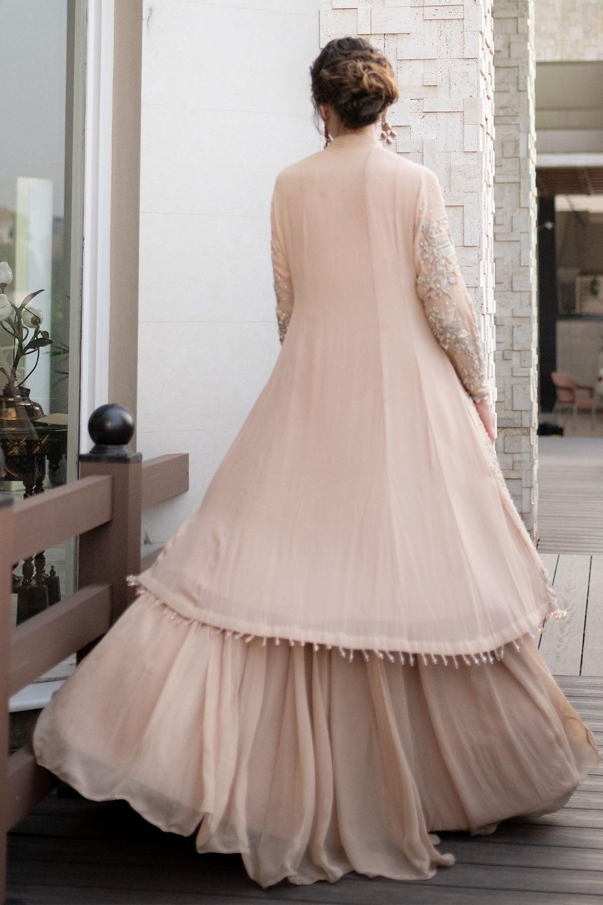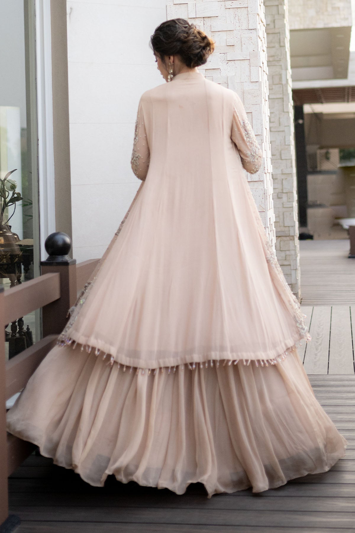Layers of pale peach chiffon are cut into a flared lehnga and bustier . A matching long jacket with mughal scenery is paired with the piece , very intricate handwork embellished with kora dabka shows the finest craftsmenship .