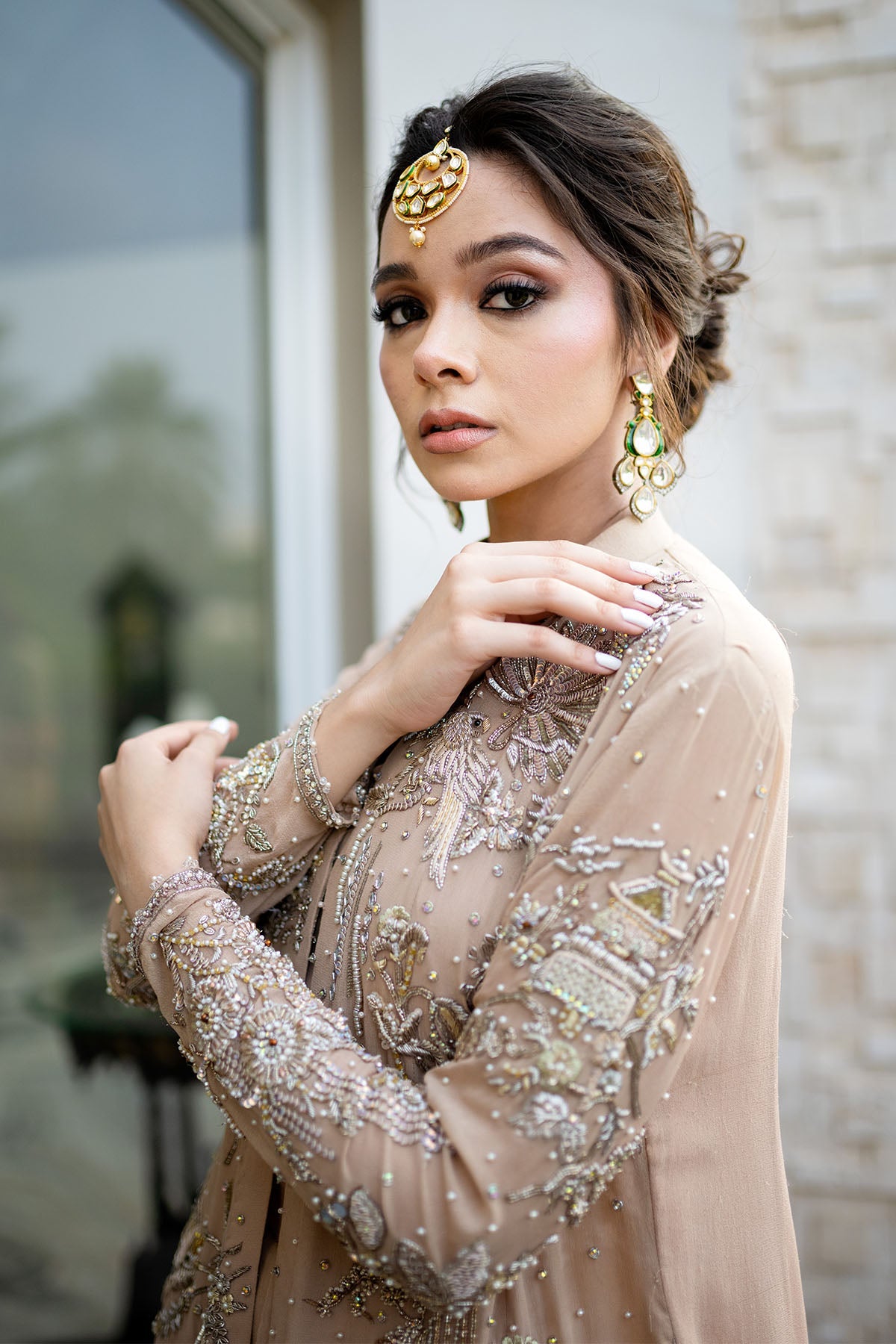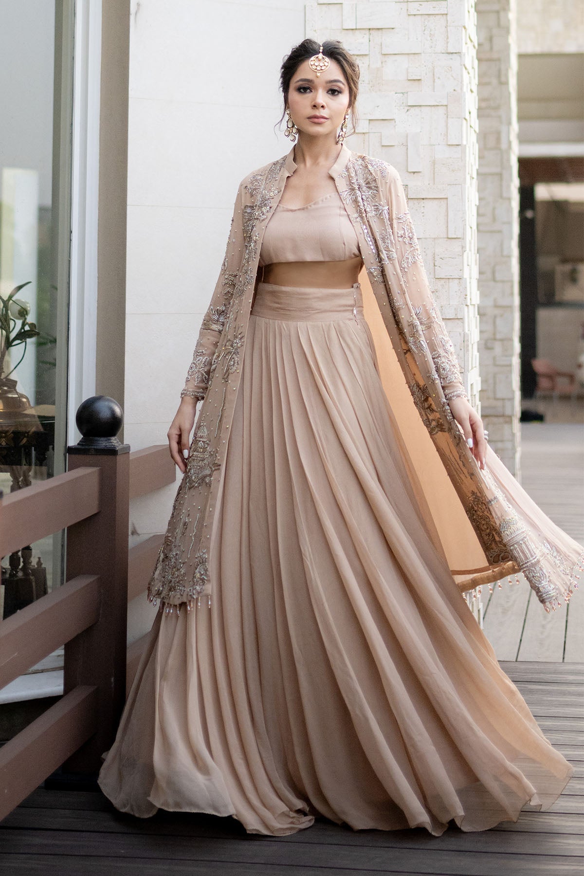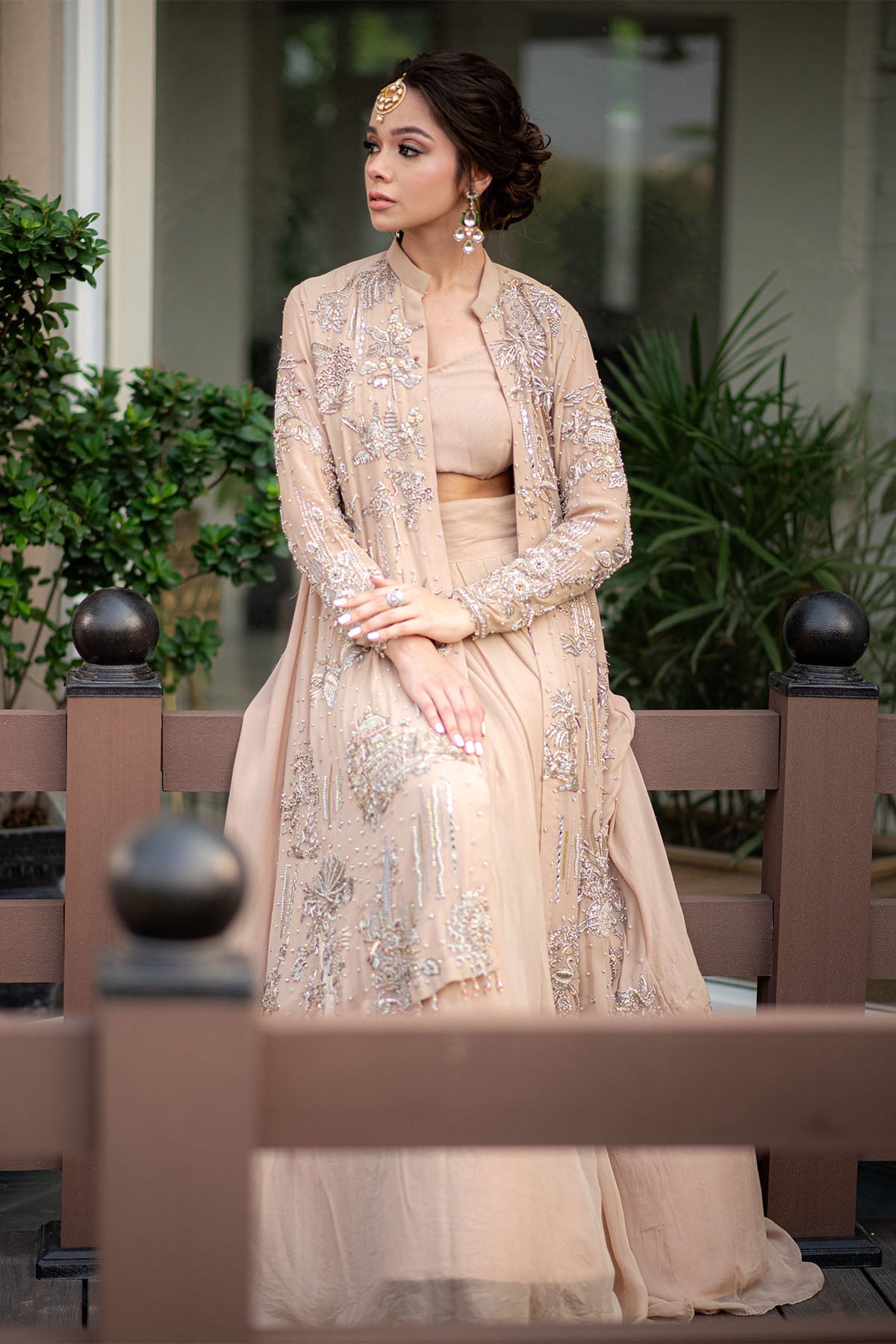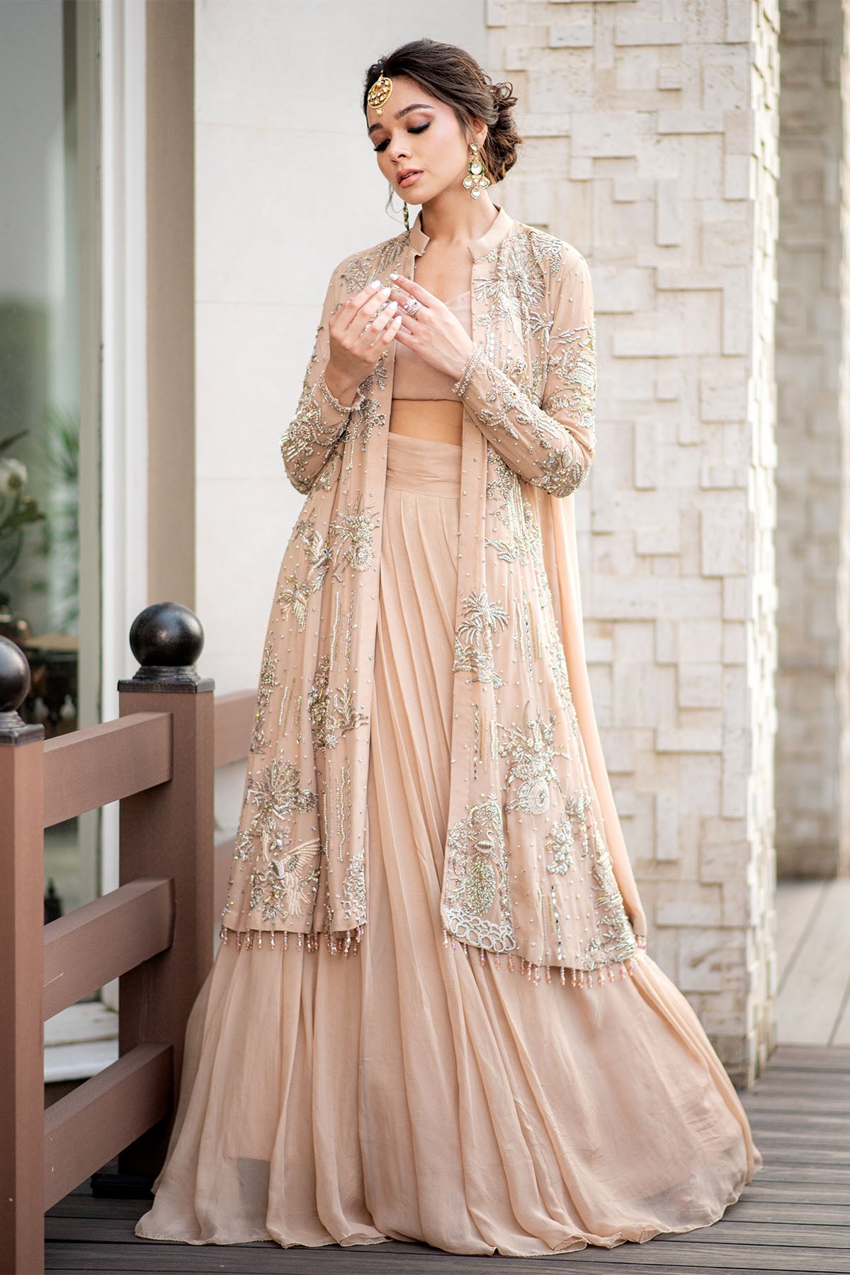 Layers of pale peach chiffon are cut into a flared lehnga and bustier . A matching long jacket with mughal scenery is paired with the piece , very intricate handwork embellished with kora dabka shows the finest craftsmenship .