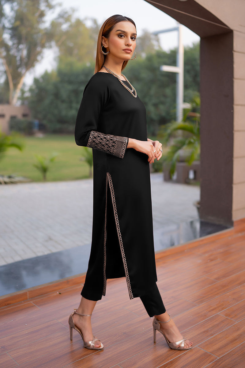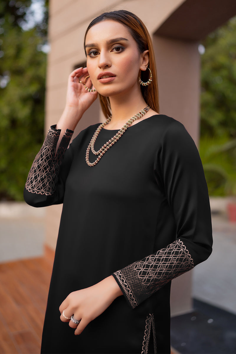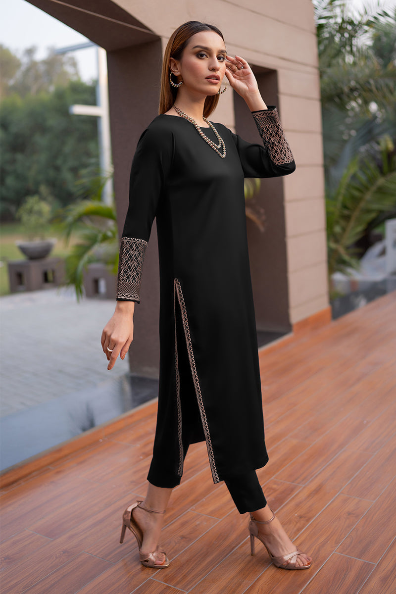 This graceful black color shirt with intricate embroidery on sleeves and side slits in copper color.