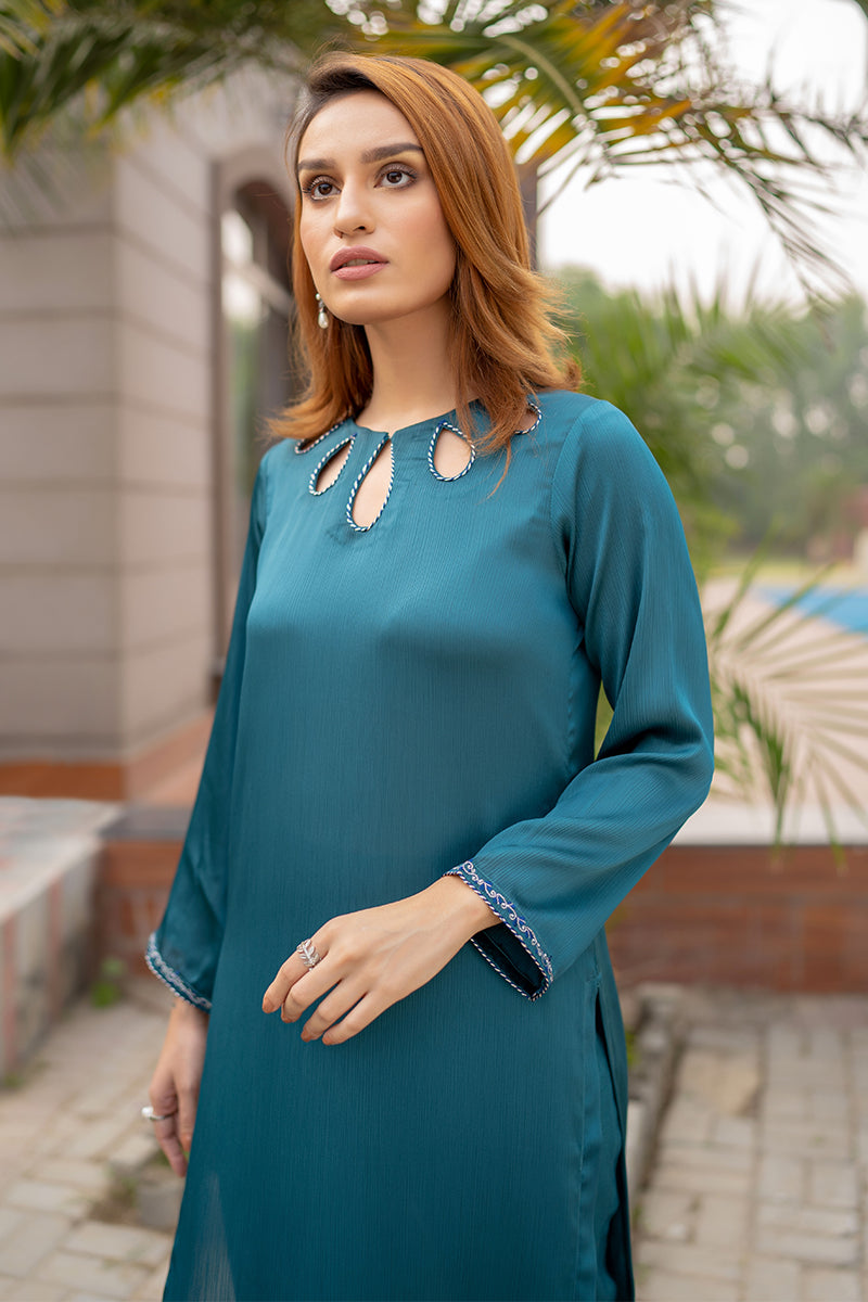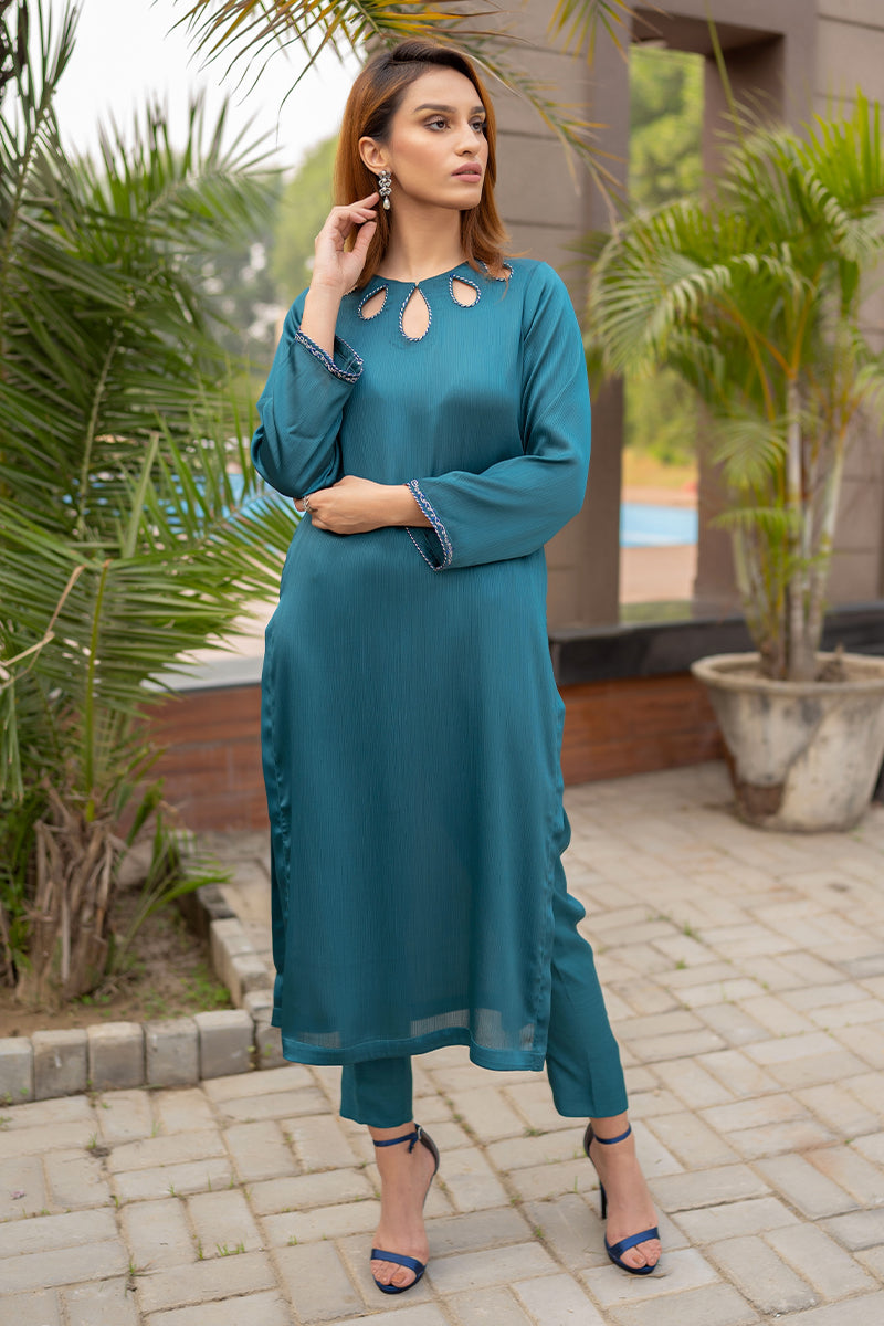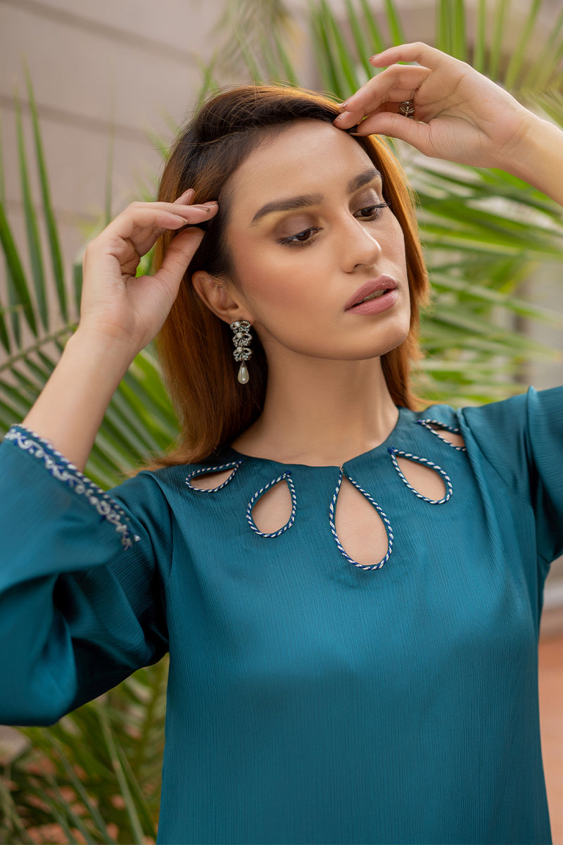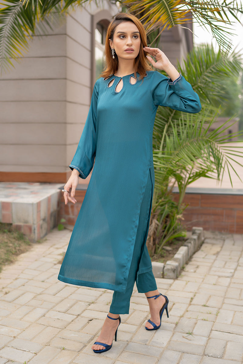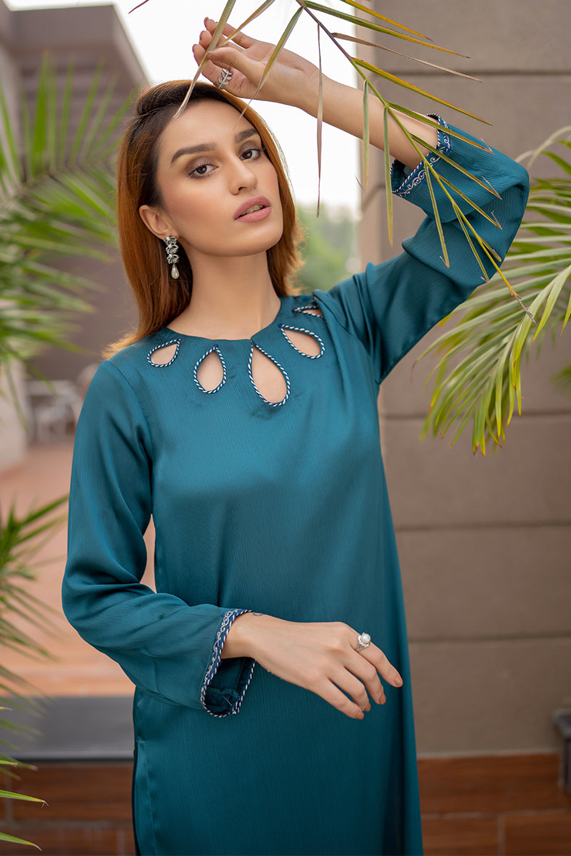 This elegant straight shirt silhouette features an embroidered key-hole neckline on a charming midnight green color. Sleeves are enhanced with intricate embroidery at the opening. This traditionally rich ensemble is an ideal option to embrace at festive occasions.