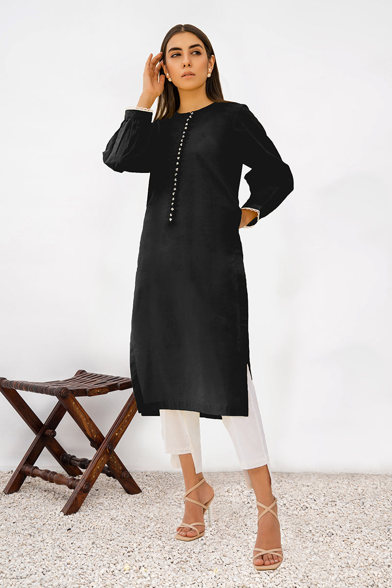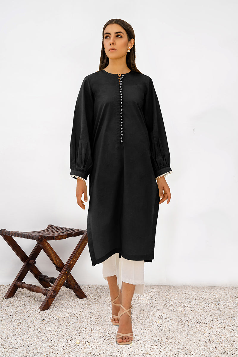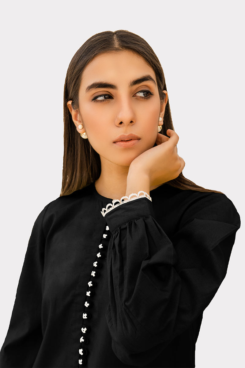 A kurta with an elongated silhouette, ‘Rare black’ is adorned with delicately embroidered loop buttons at the placket and sleeves are finished off with gathers and scallop lace. This simple yet chic design is the perfect summer ensemble for the fashion-forward woman. With a classically rooted silhouette, this trendy kurta will pair well with one of our classic trousers.