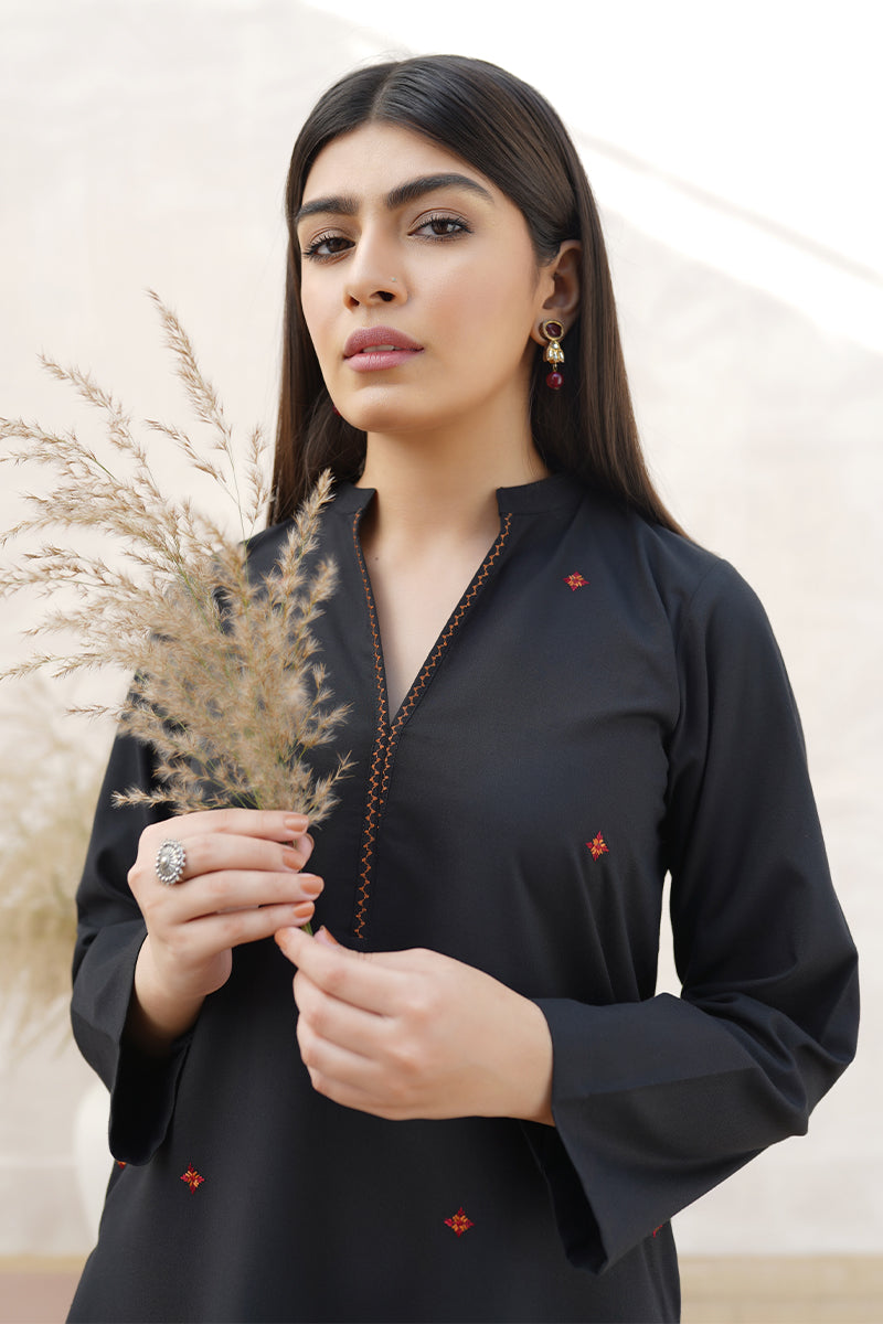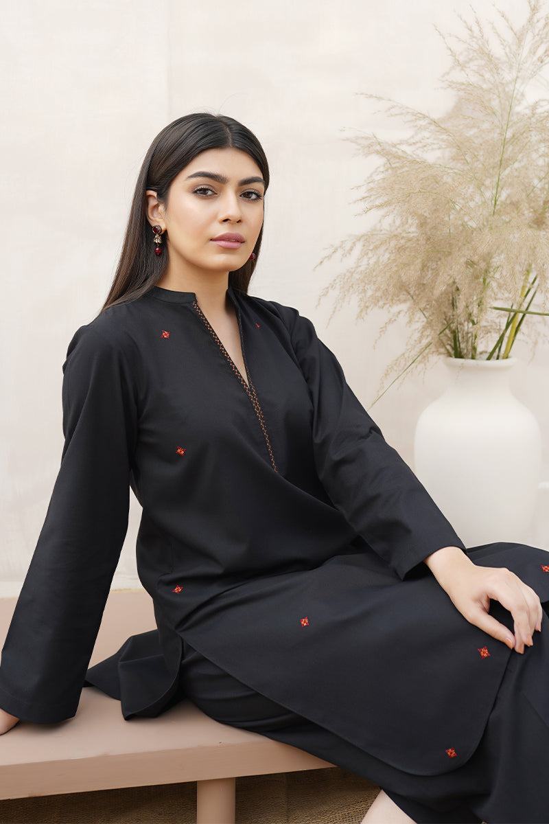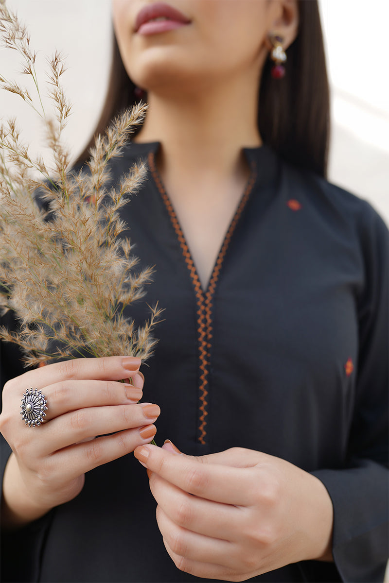 "Raven Rose“ features a captivating composition on a timeless black canvas. Traditionally enriched with intricate embroidery at placket and an overall motif spray in vibrant hues. Style this outfit to evening festivities and be a fashion statement this winter season.