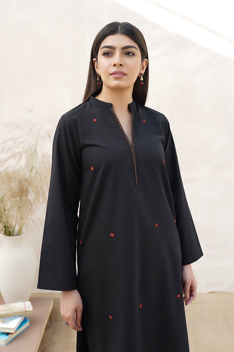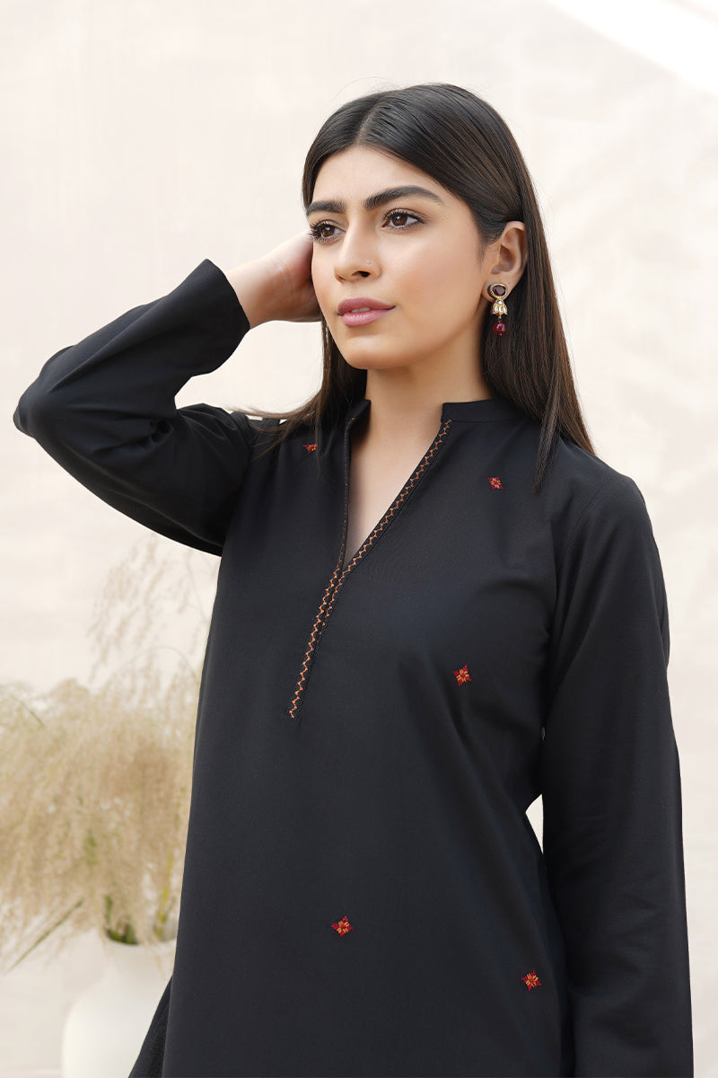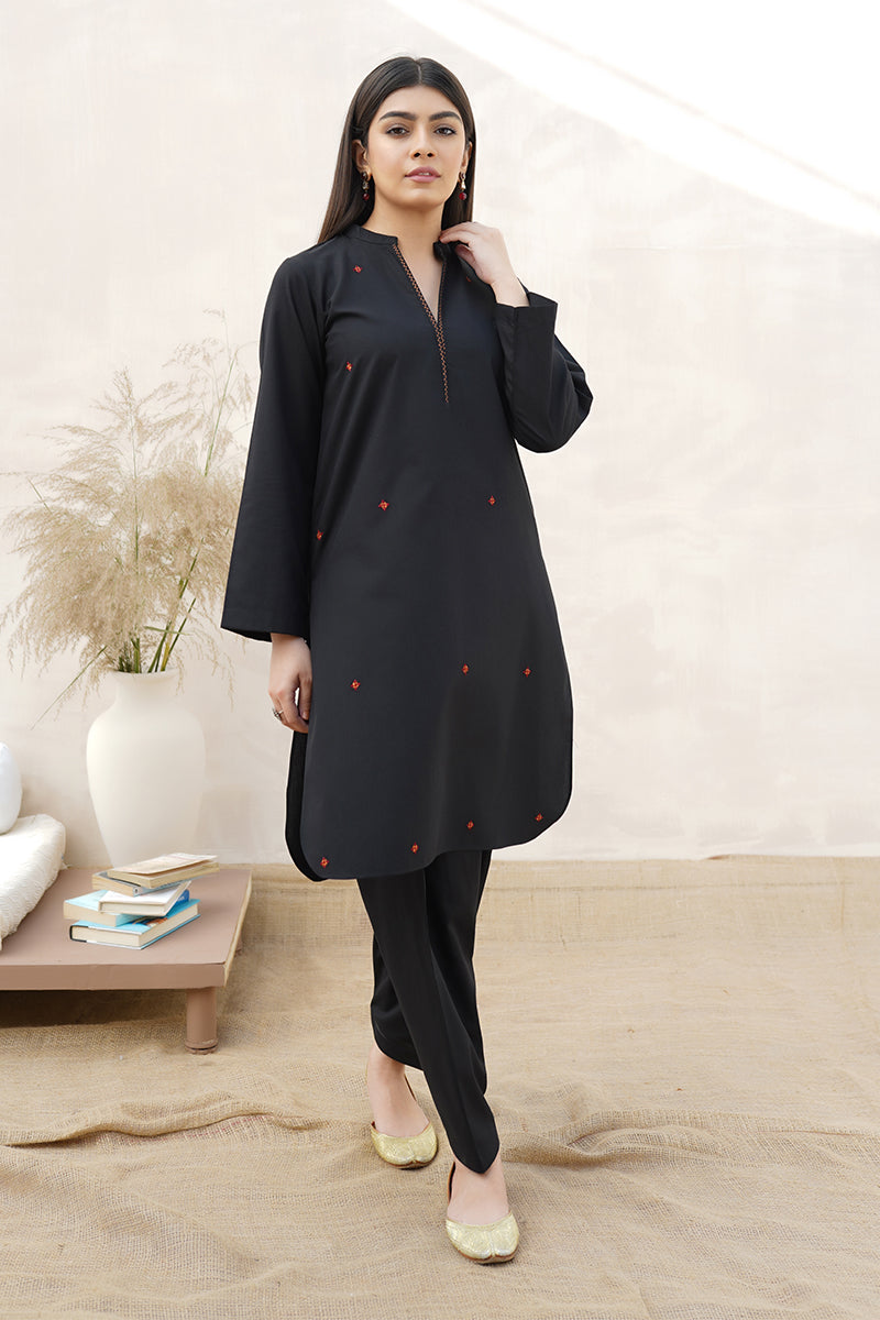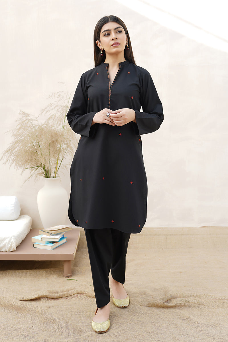 "Raven Rose“ features a captivating composition on a timeless black canvas. Traditionally enriched with intricate embroidery at placket and an overall motif spray in vibrant hues. Style this outfit to evening festivities and be a fashion statement this winter season.