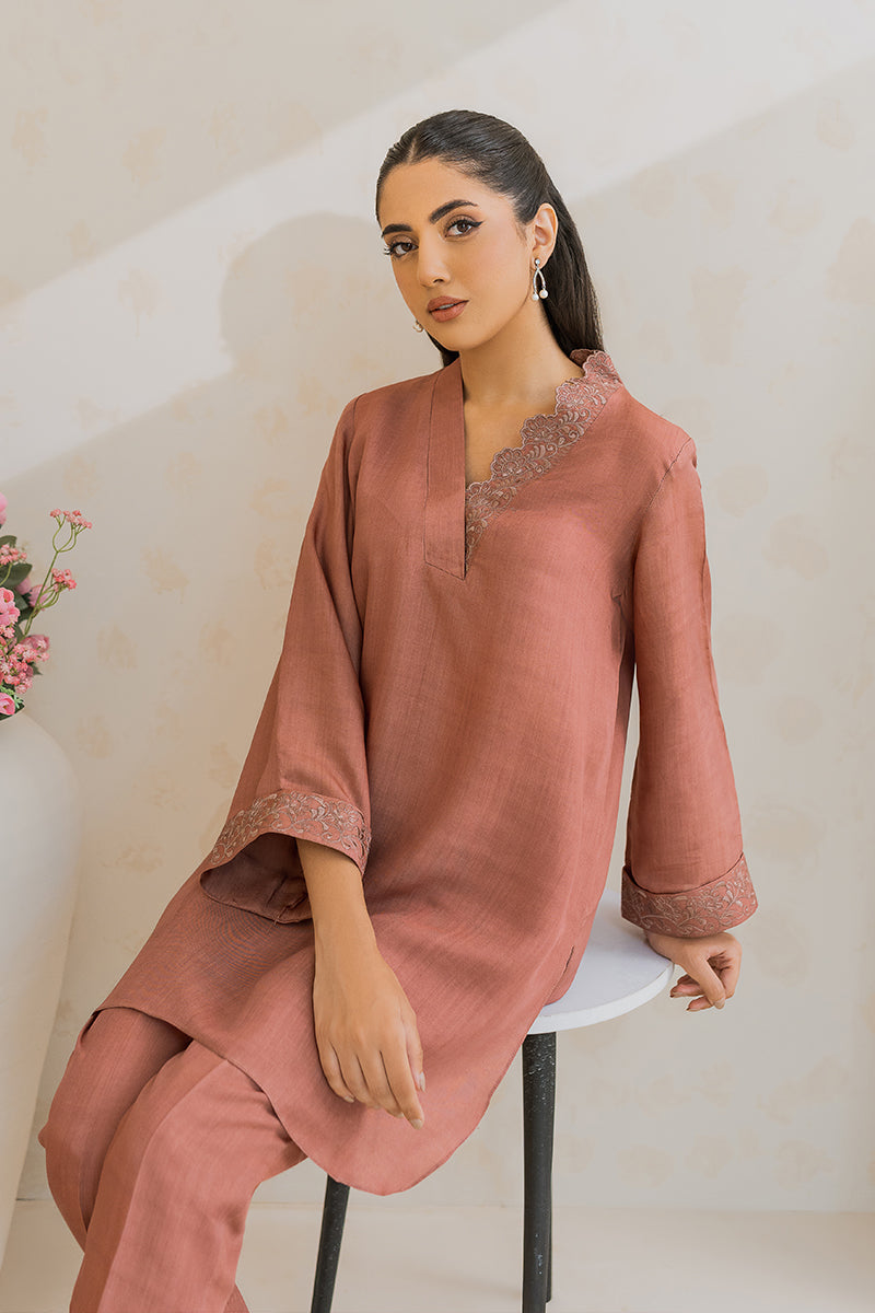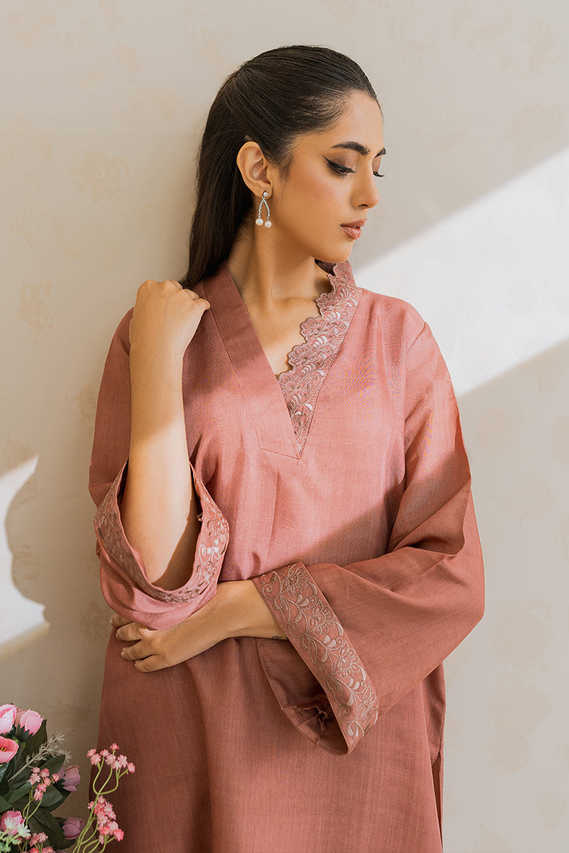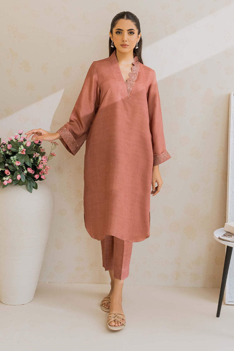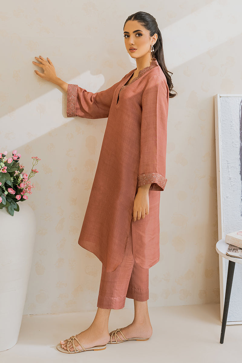 Dress to impress in our tea pink straight silhouette featuring intricate embroideries on neckline and sleeves.