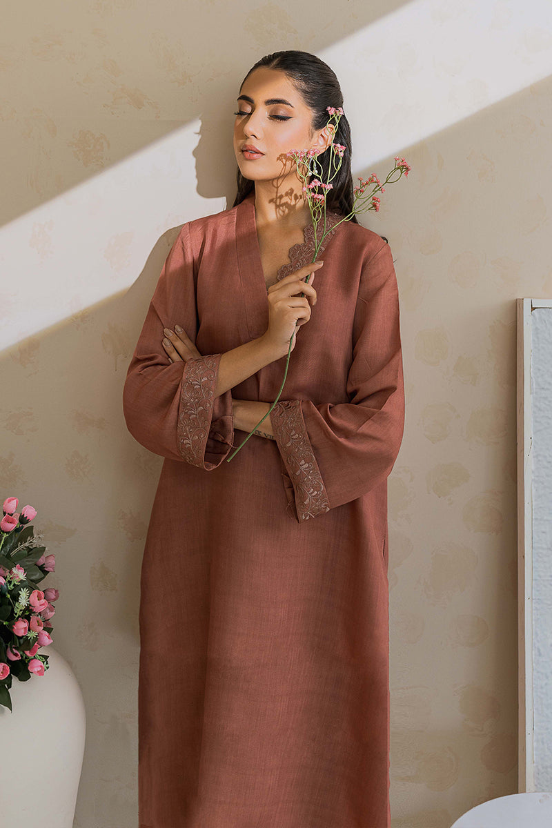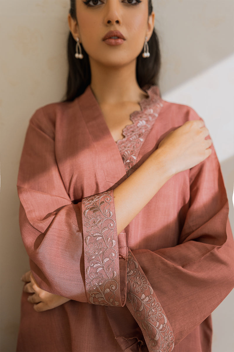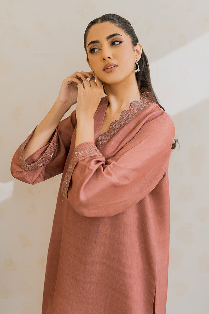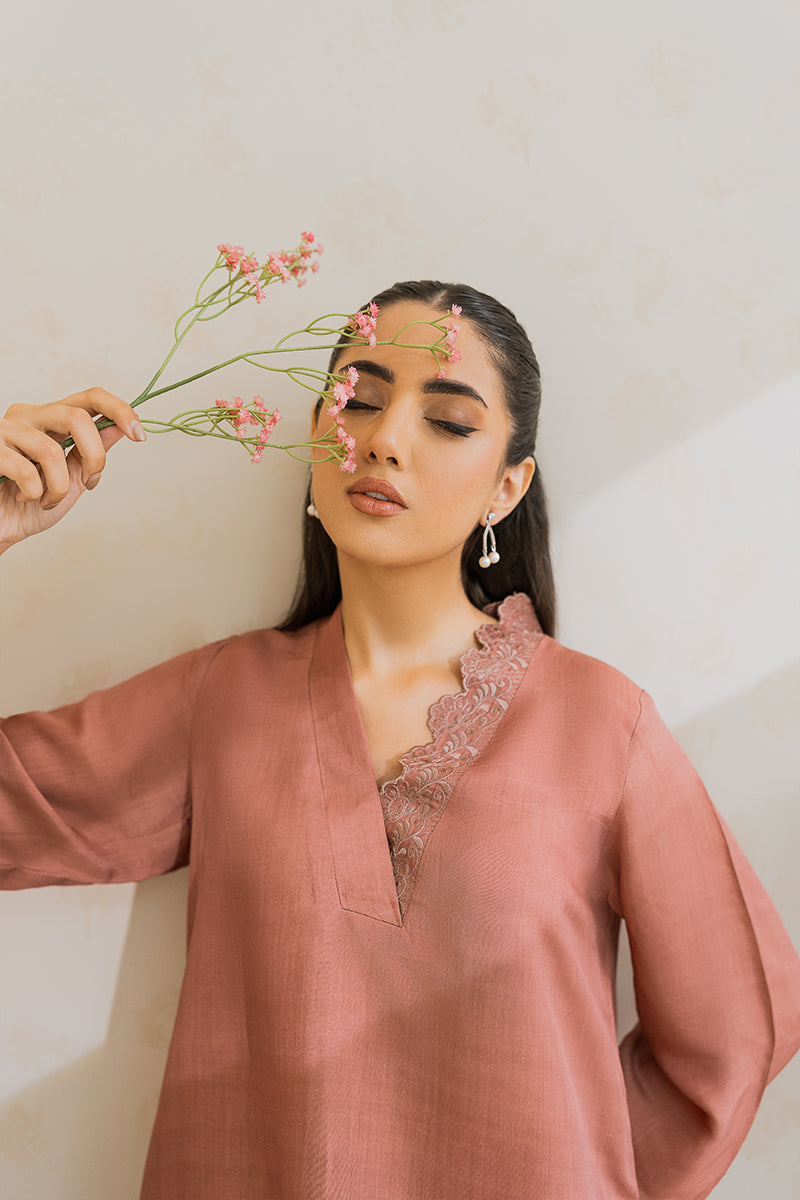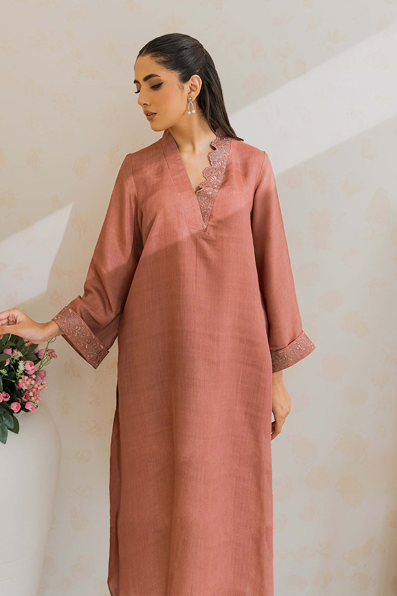 Dress to impress in our tea pink straight silhouette featuring intricate embroideries on neckline and sleeves.