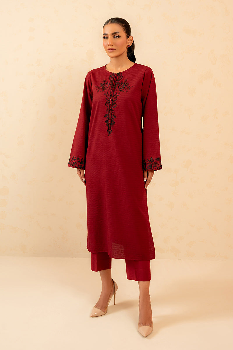 Step out in style with ‘Rowena’ A textured 2 piece with embroidery on neckline and sleeves. The embroidery adds a touch of elegance and charm, making it a stand out piece for any occasion.