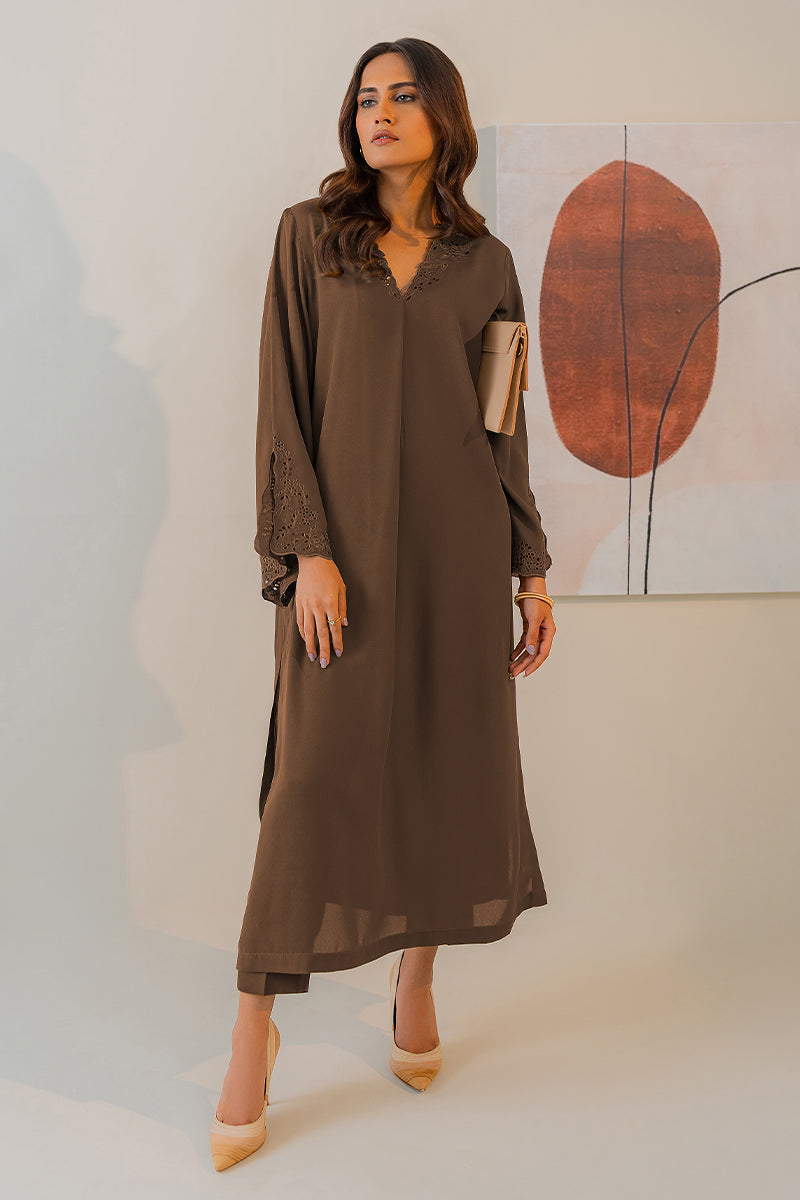 Indulge in the soothing charm of 'Sable' a coco brown two-piece set that invites you to immerse yourself in refreshing hues. This fabric features exquisite cutwork embroidery on the sleeves and neckline, adding a stylish ambiance..