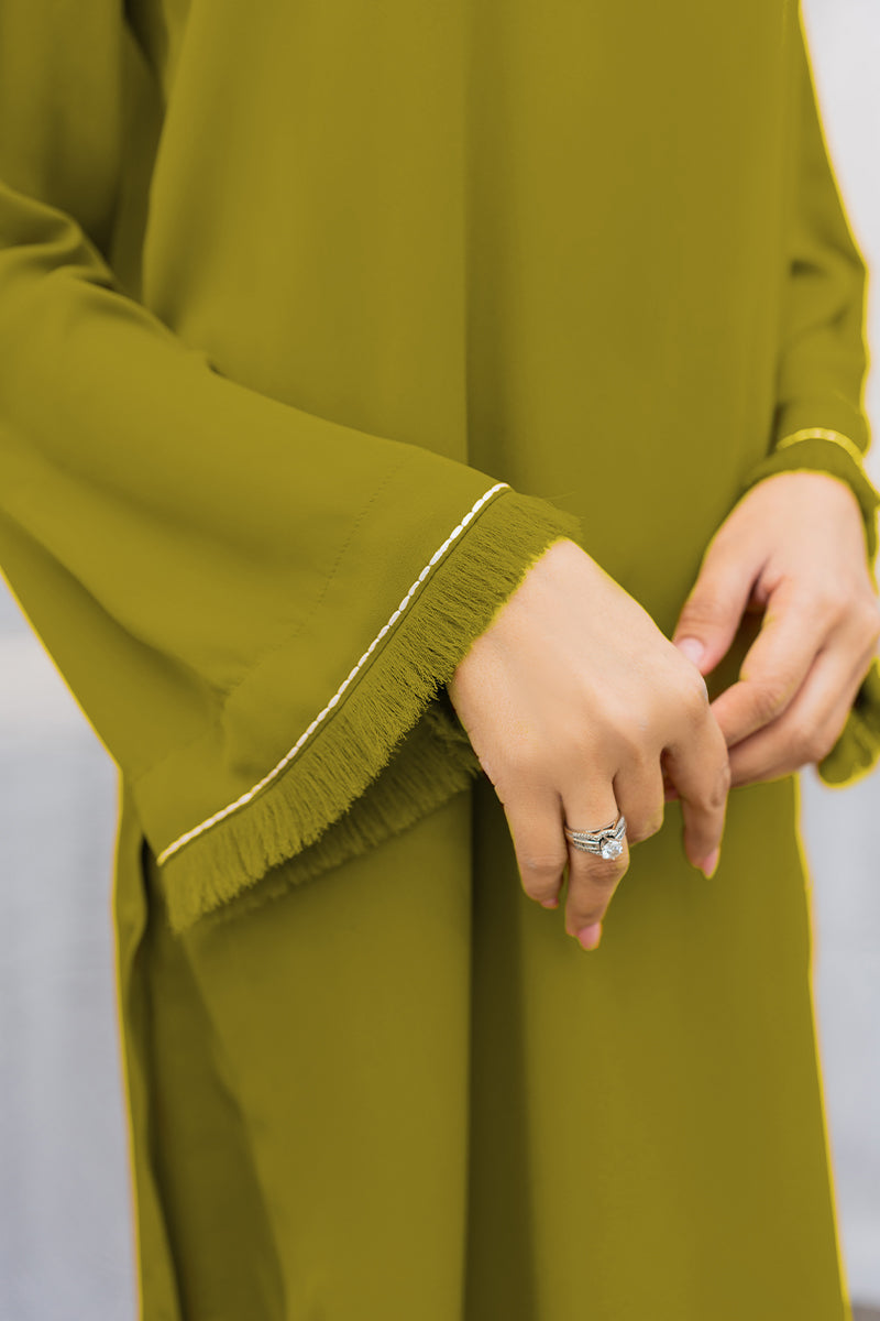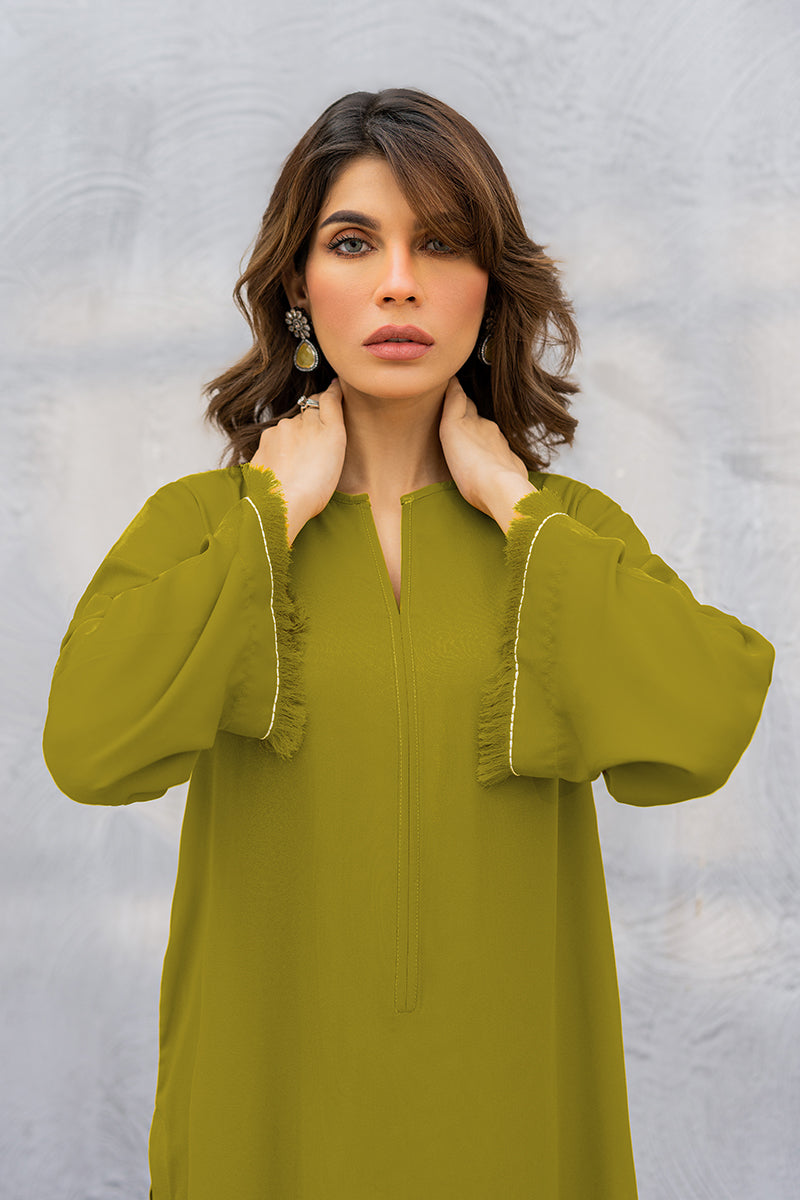 For a chic look, adorn this flowy silhouette featuring fared edges on front and sleeves.