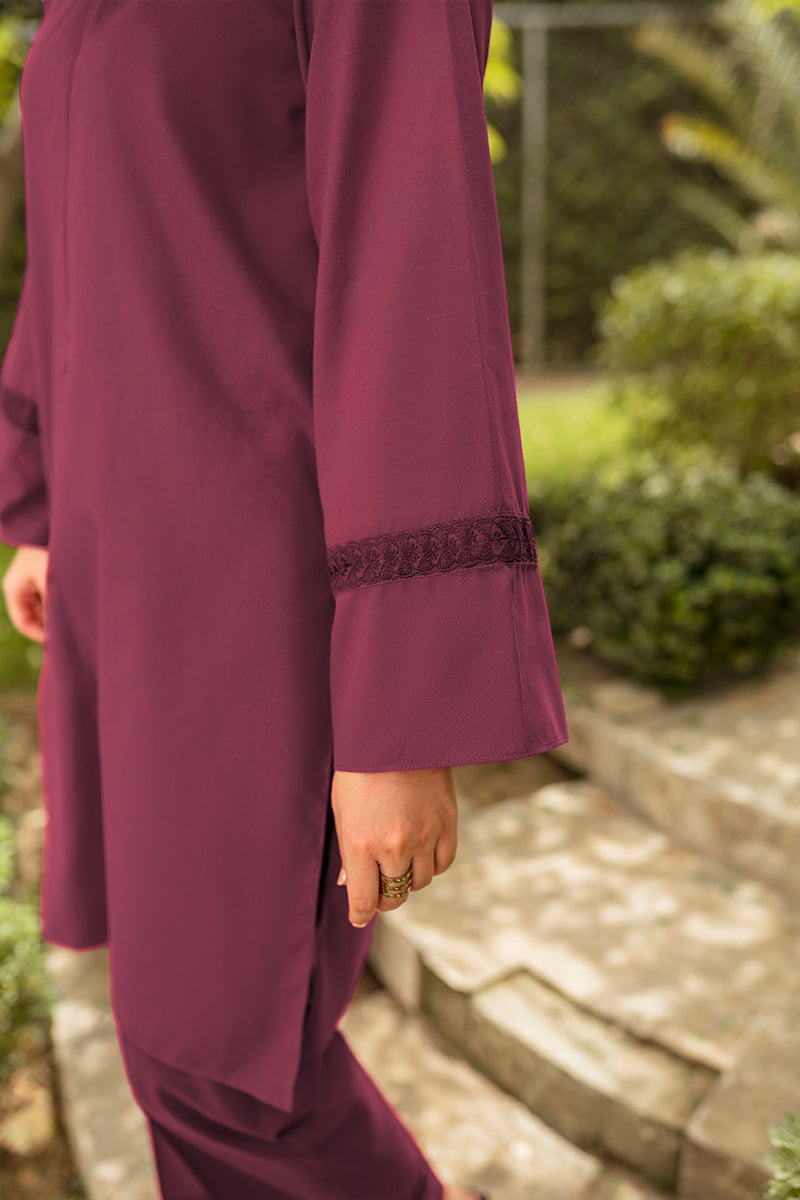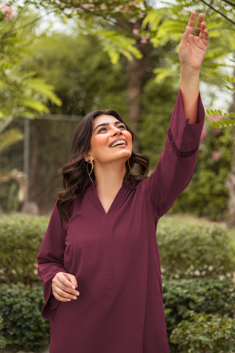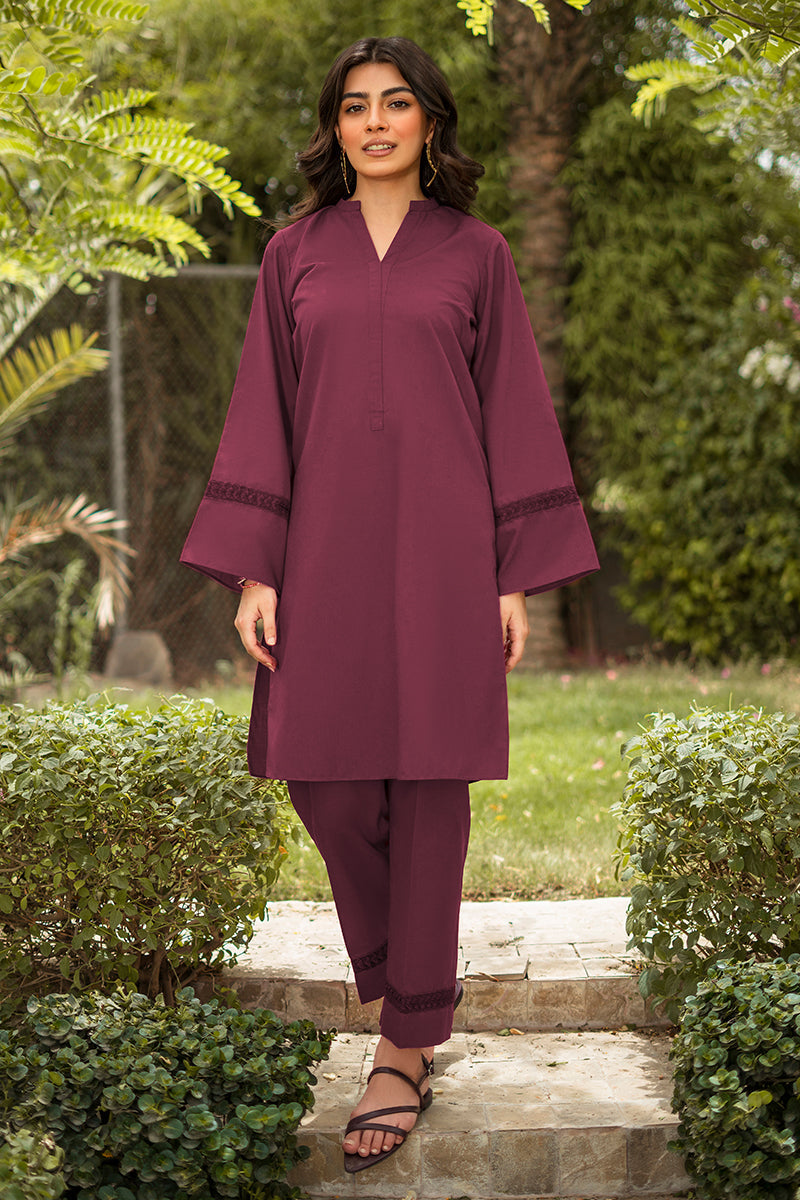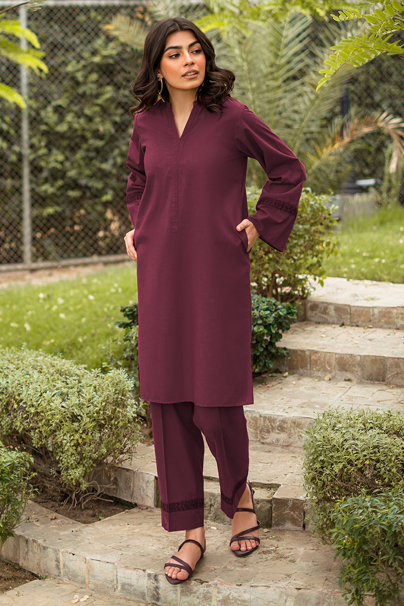 Propagate a classic look with this ready to wear maroon cotton two piece featuring a ban neckline with a placket and side pockets. Intricate embroidery on sleeves