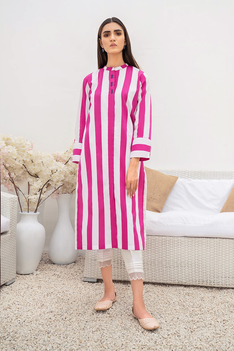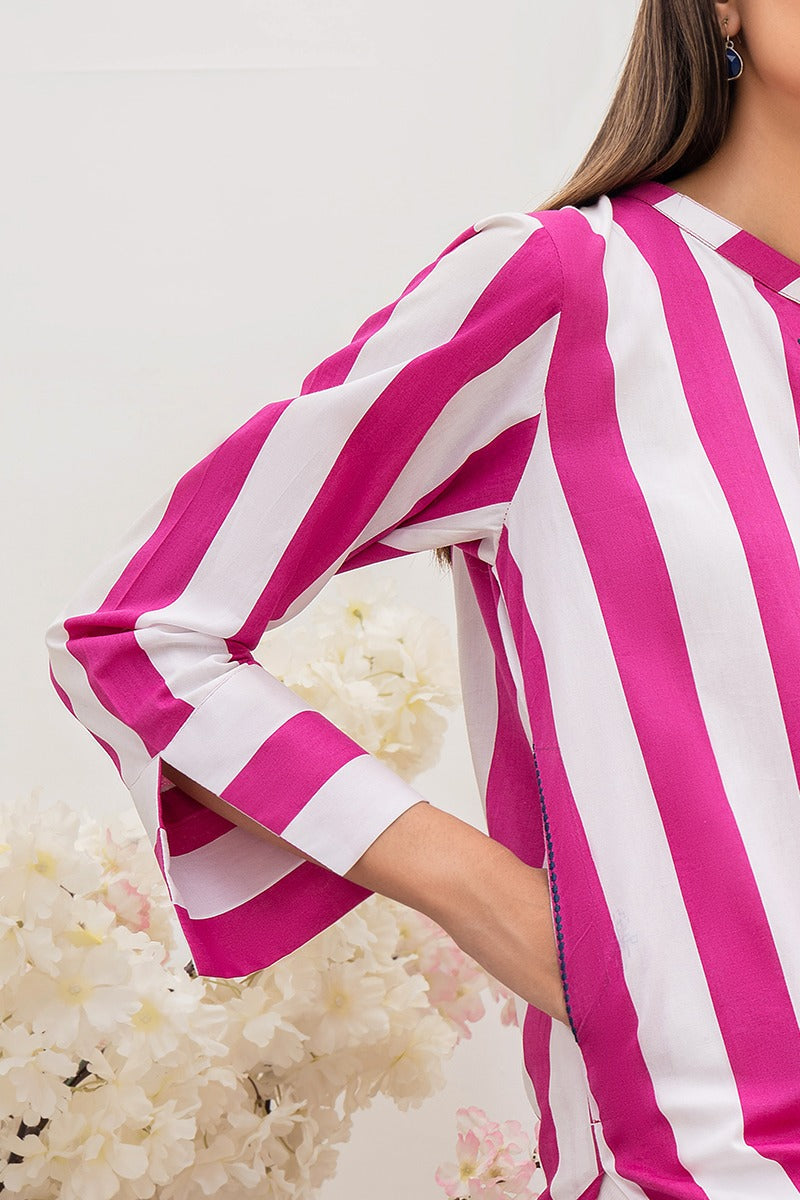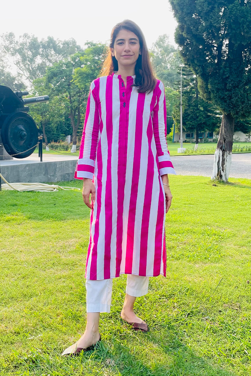 A quirky kurta, 'Scarlet Pink' features ethnic embroidery detail on placket overlaid on sophisticated pink and white stripes and cutesy embroidery detail on pocket. Pair with nude lips and get ready to take on your day in style!.