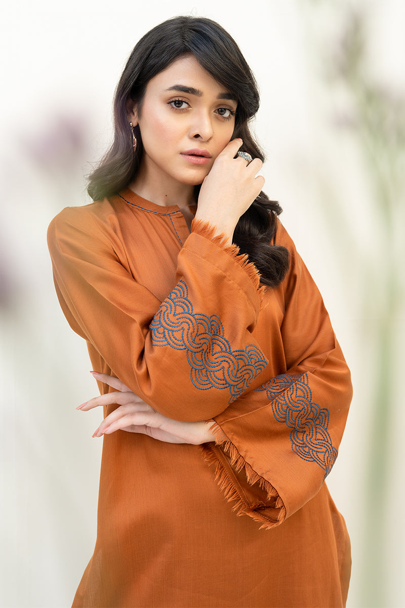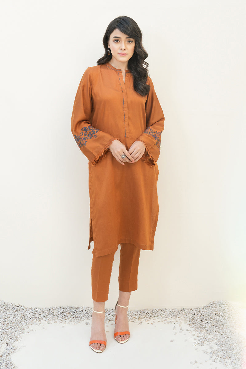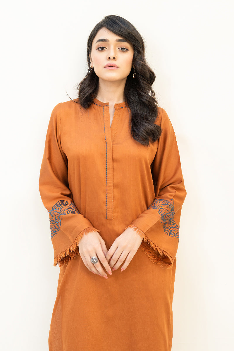 On a luxe gleaming rust base, Sedona portrays a graceful composition of contrasting details on our classic Kurta silhouette. It features intricate embroidery stitches on the placket, straight flowy sleeves adorned with a heavy embroidered border and frayed edges. Paired with tonal trousers this sophisticated outfit is a pure example of timeless elegance.