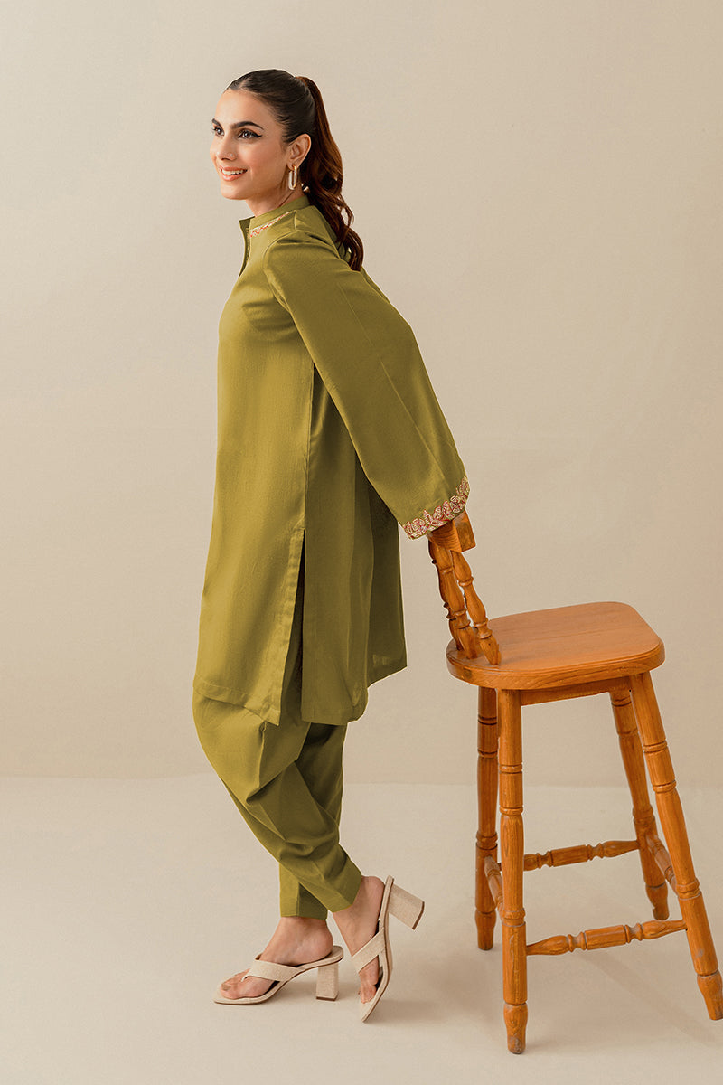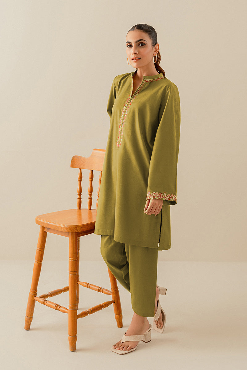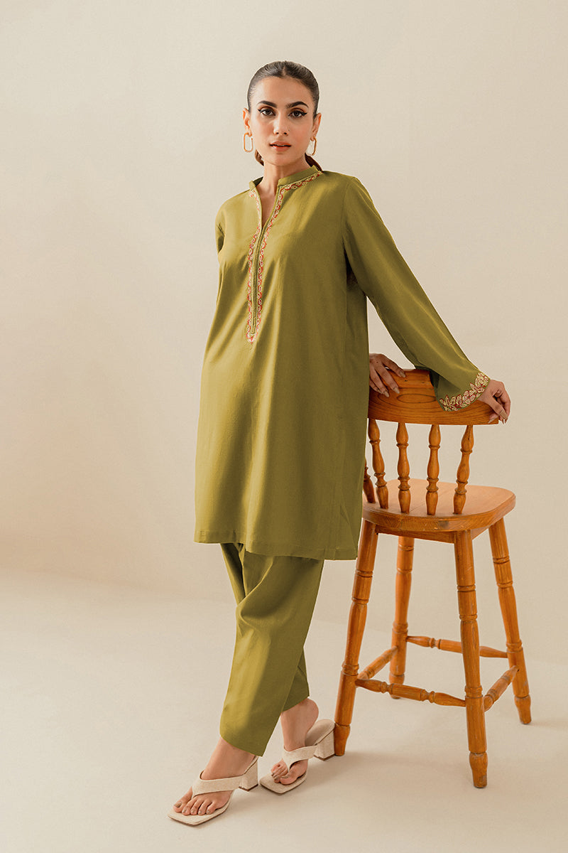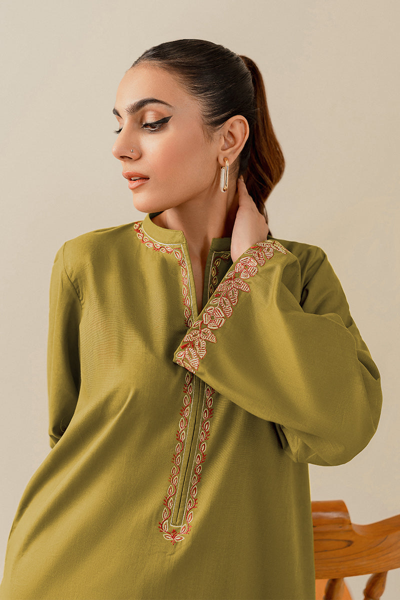 Step into winter with 'Sesame' a stylishly relaxed ensemble that strikes the perfect balance between cultural richness and modern sophistication. The A-line shirt takes center stage, showcasing a centi-band embroidered neckline and sleeve border. Paired seamlessly with a classic shalwar this is a must have wardrobe essential.