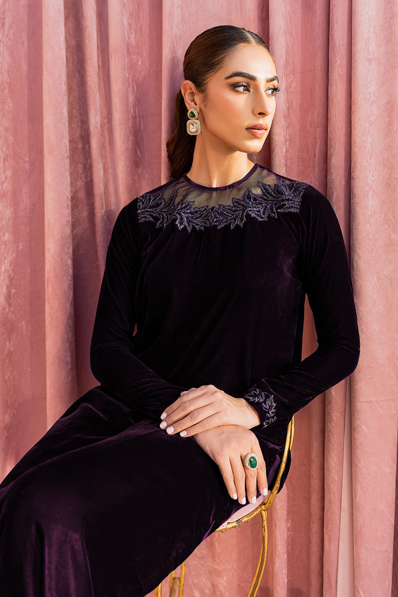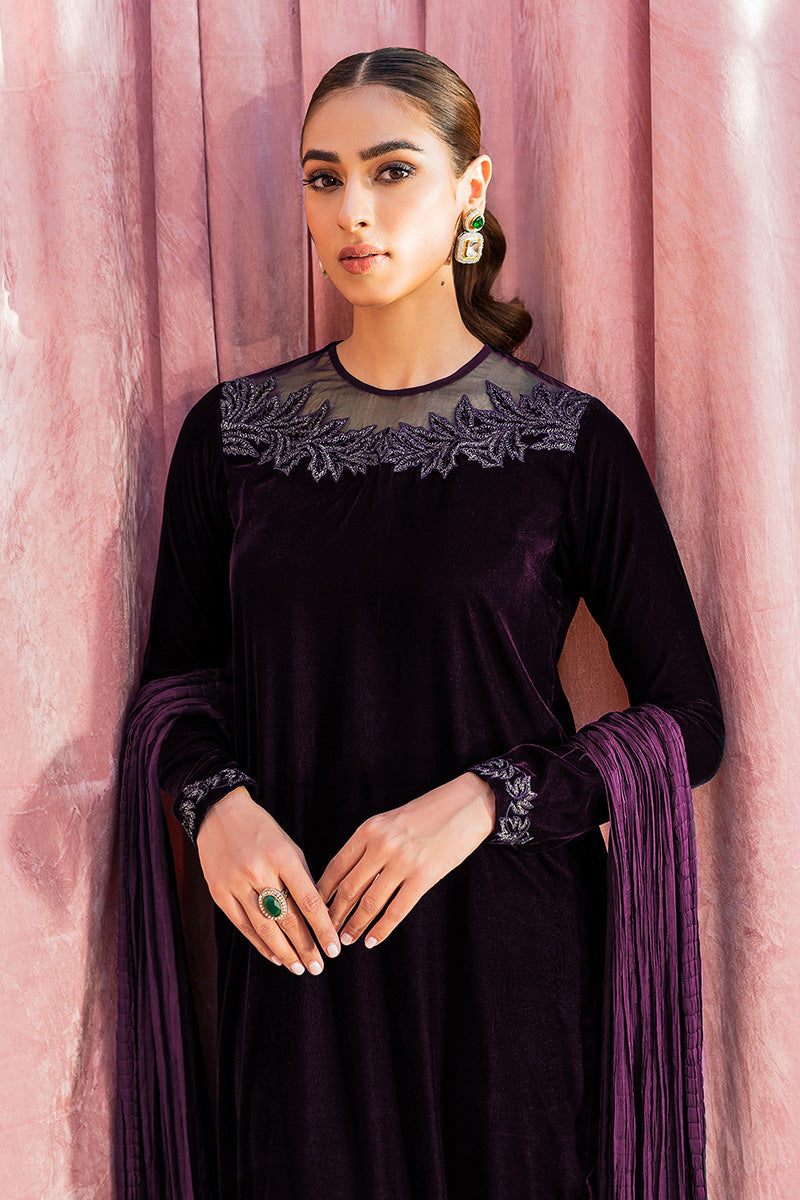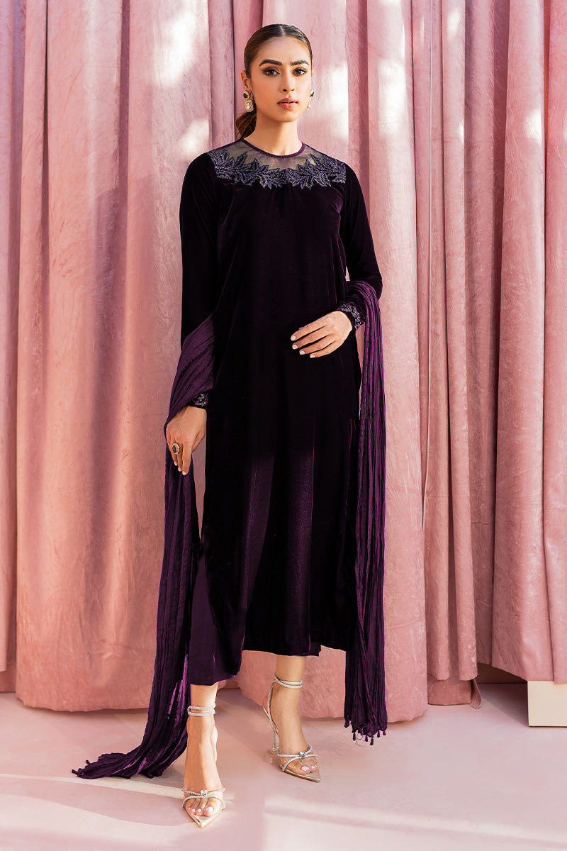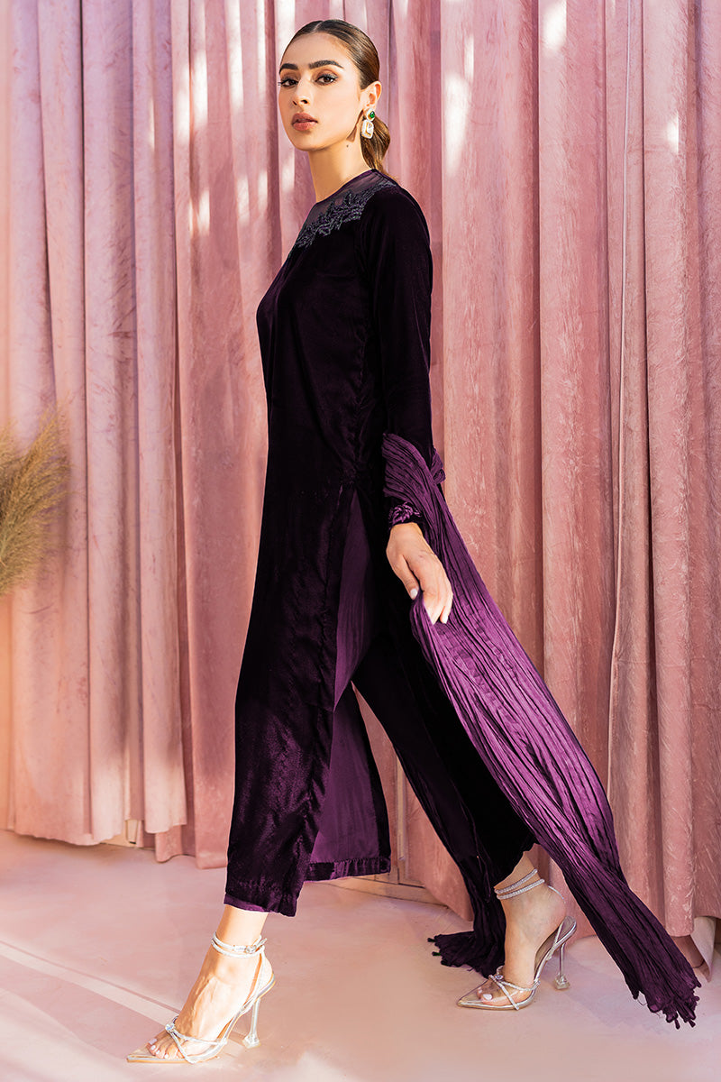 This ageless classic is perfect piece for any festive event. Tone on tone embroidery along with hints of purple and silver makes it gaze worthy. It comes with simple straight pants and same tone crushed dupatta.