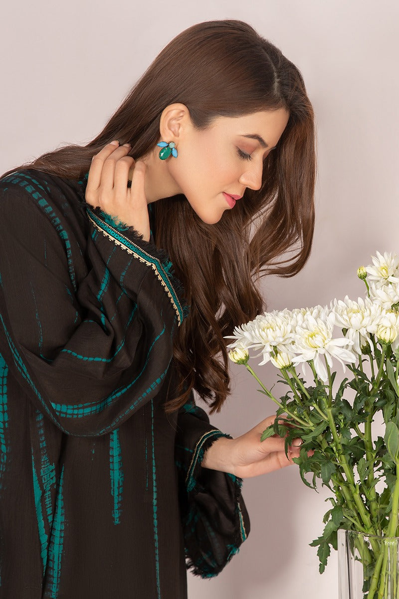 ‘Teal Black’ features tie & dye techniques in marine shades overlayed on a classic black base. The sleeves are enhanced with ethnic embroidered Patti, finished with frayed edges. It is the perfect kurta for your summer soirée.