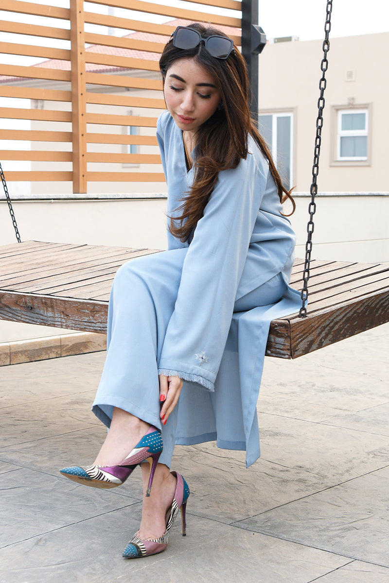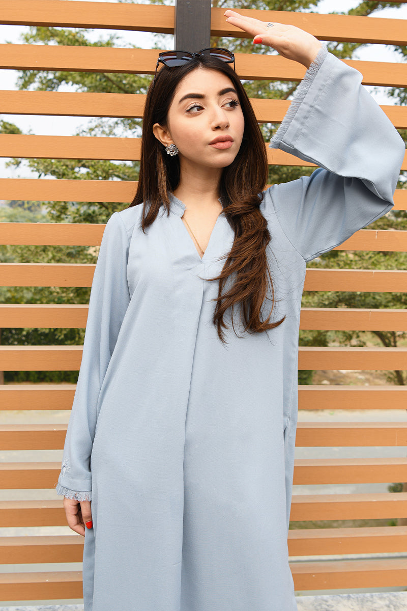 Perfect Ice blue for the season, adorn this classic straight silhouette featuring mesmerizing floral motif at the sleeves.