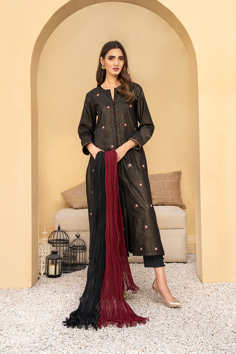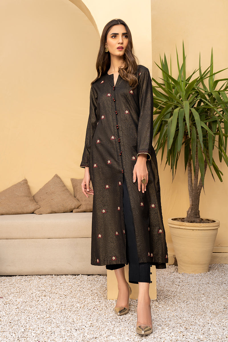 A beautifully crafted long A-line shirt rendered in luxe shimmery fabric, 'Tinted Black' features gorgeous floral embroidery and gotta edging on the sleeves and side slits