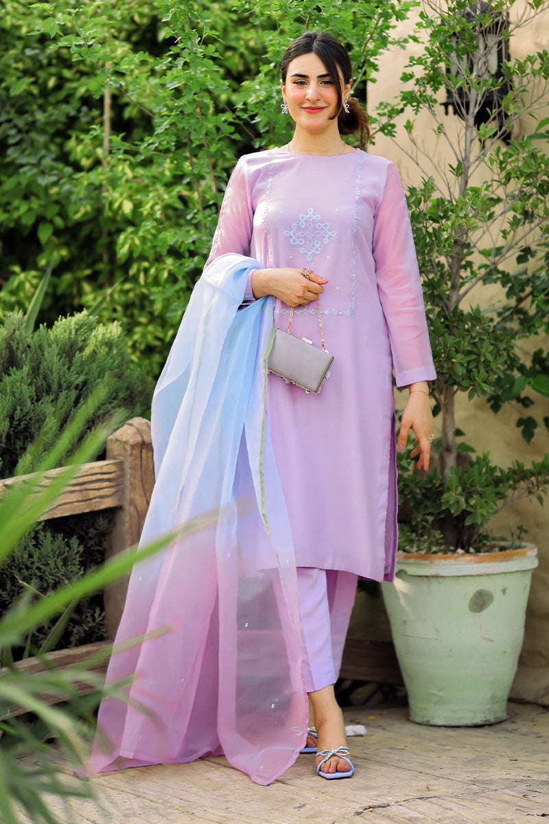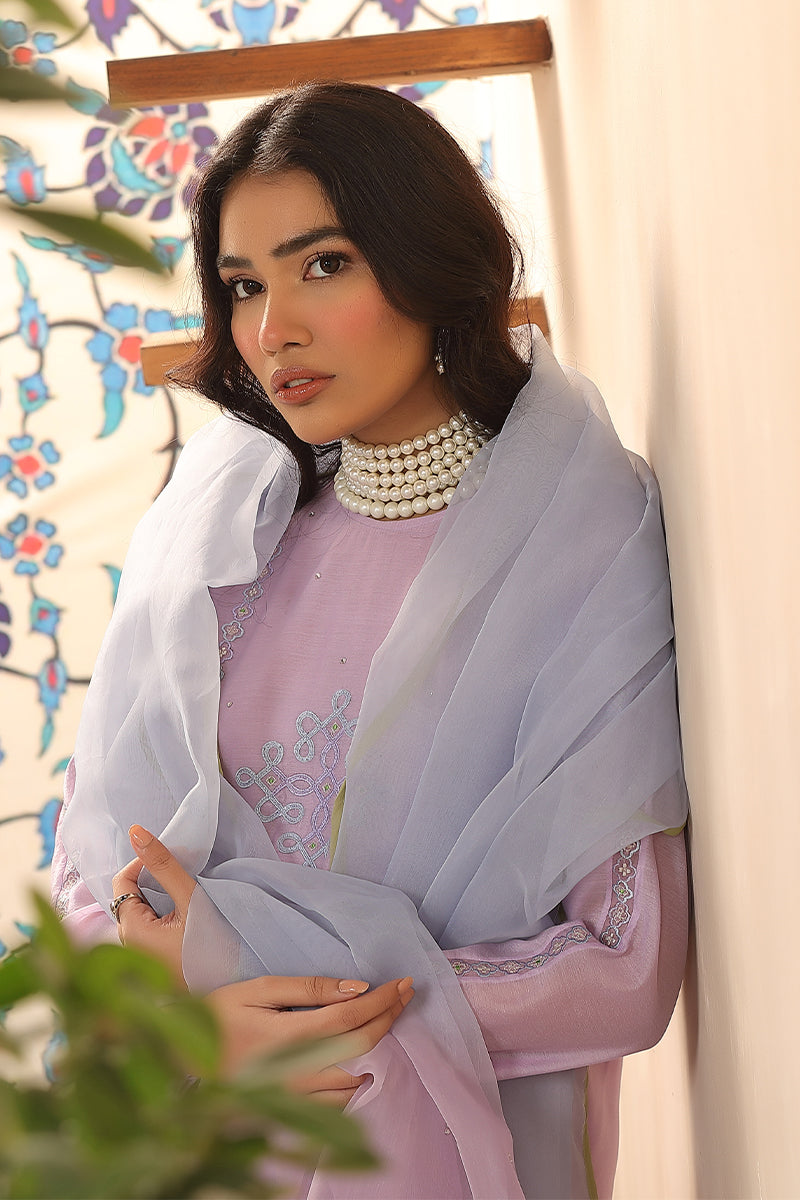 This classically elegant ensemble is rendered using a fresh lavender-hue. Features an elongated kurta silhouette with ornate embroidery detail on the shirt and sleeves.