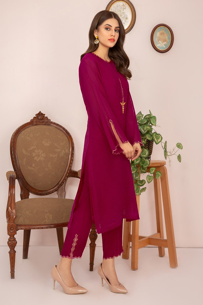 A majestic deep pink is adorned with intricate ethnic embroidery along with tilla in 'Vivid Pink.' It is crafted from a Khaadi net with scallop details on sleeves.