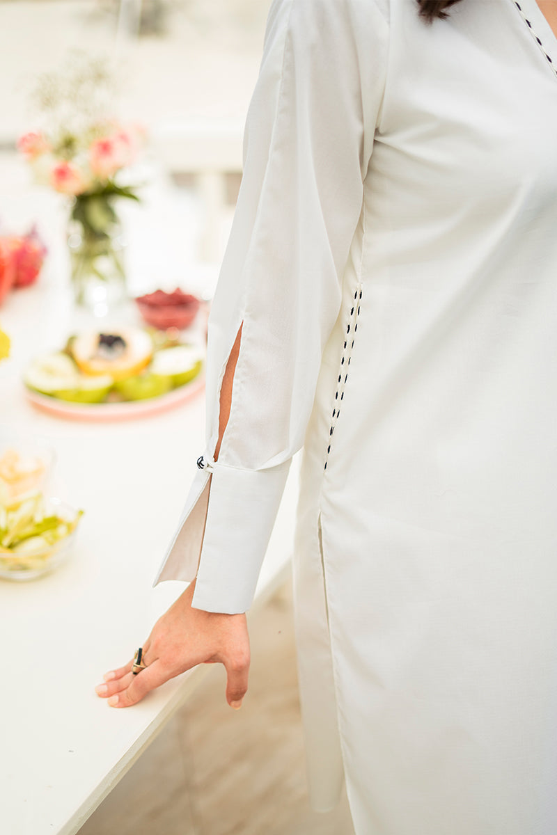 Get a classic look with this ready to wear white shirt featuring a band with V neckline with black and off-white embroidery around the placket. Cuffed Sleeves are enhanced with embroidered button detail and side pockets with embroidery are added to elevate the look. Paired with matching white shalwar this is the ultimate look for summers.