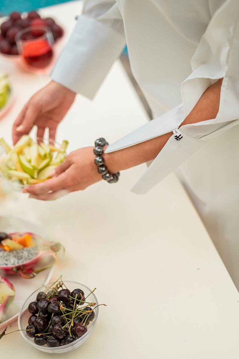 - Cuff sleeves with embroidered button detail