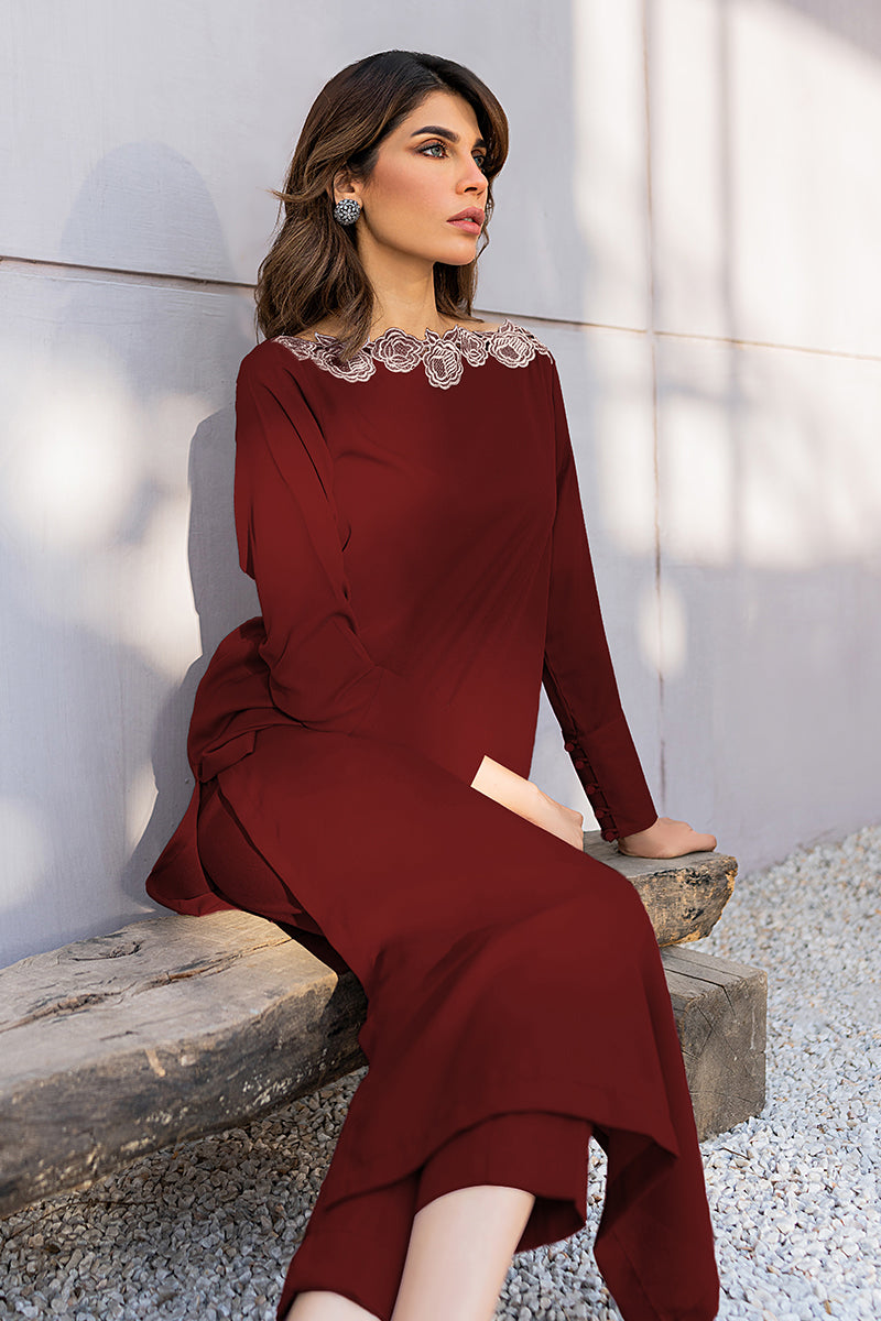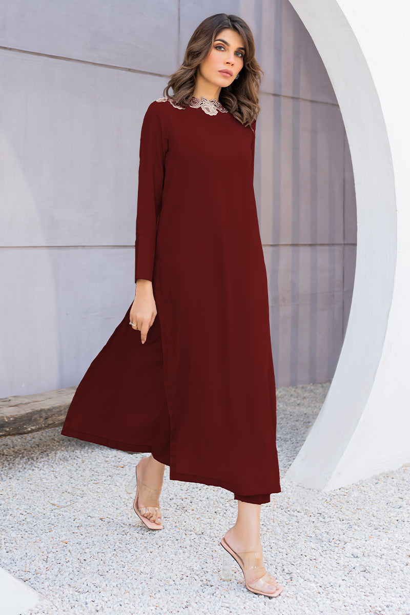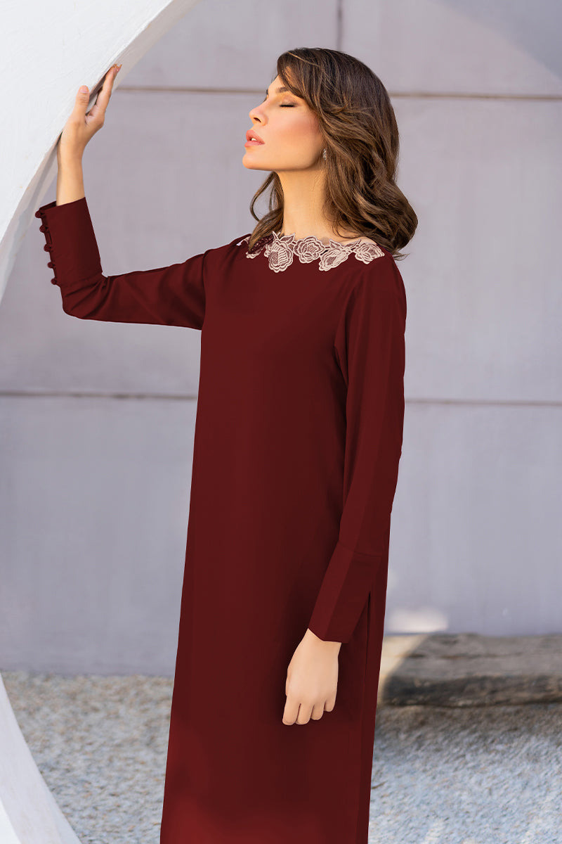 Upgrade your solids with this maroon straight silhouette, highlighting the floral embroidered neckline.