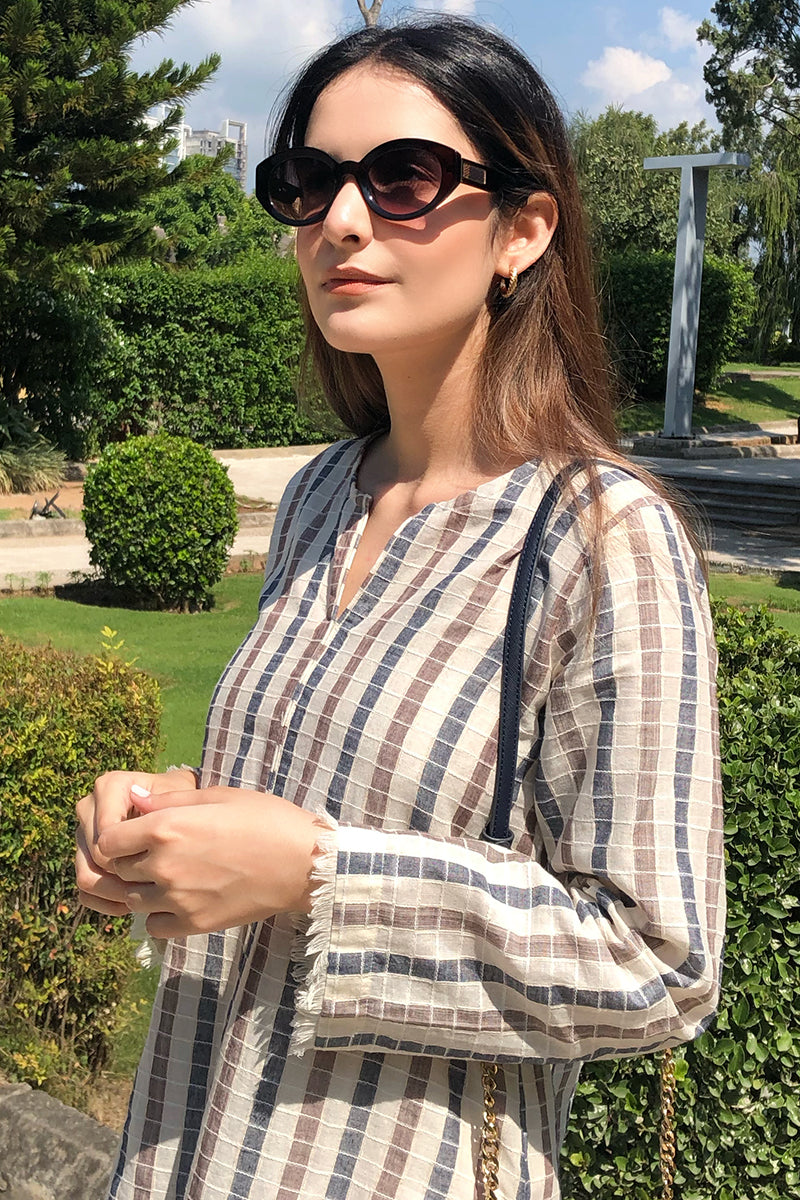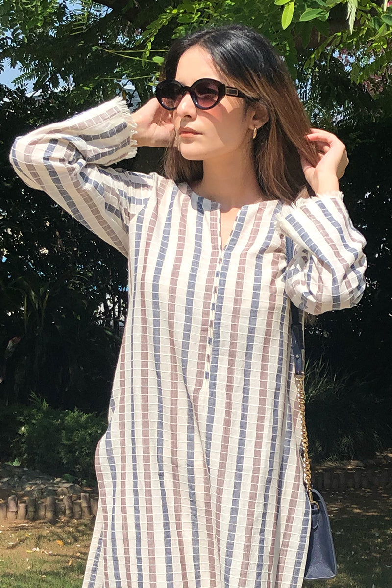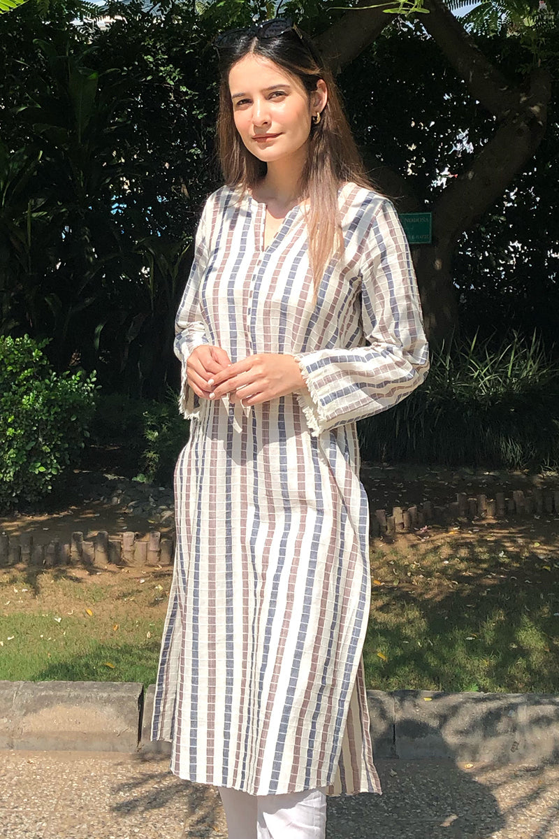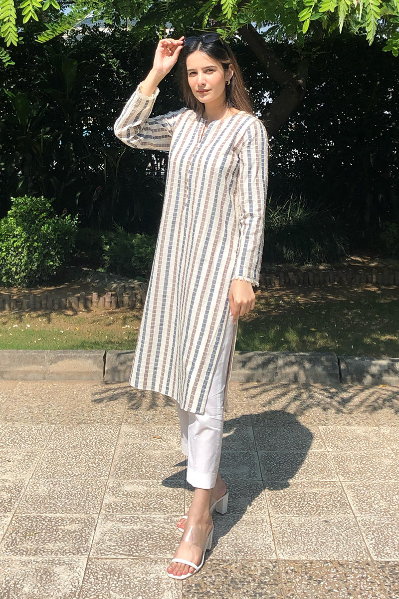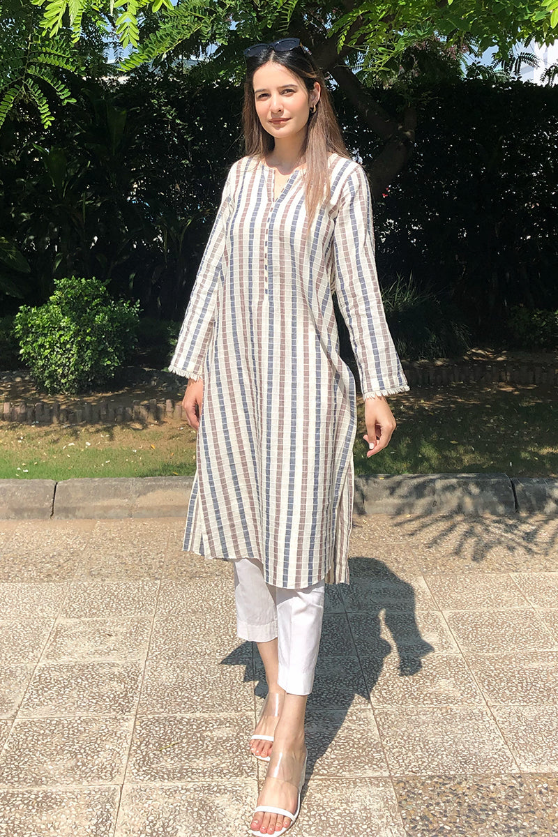 “ Yale blaze” Features a subtle kurta silhouette beautified with round neckline and front piping. It has straight sleeves with frayed edges. This wonderful light hued outfit will be the perfect pick of the season.