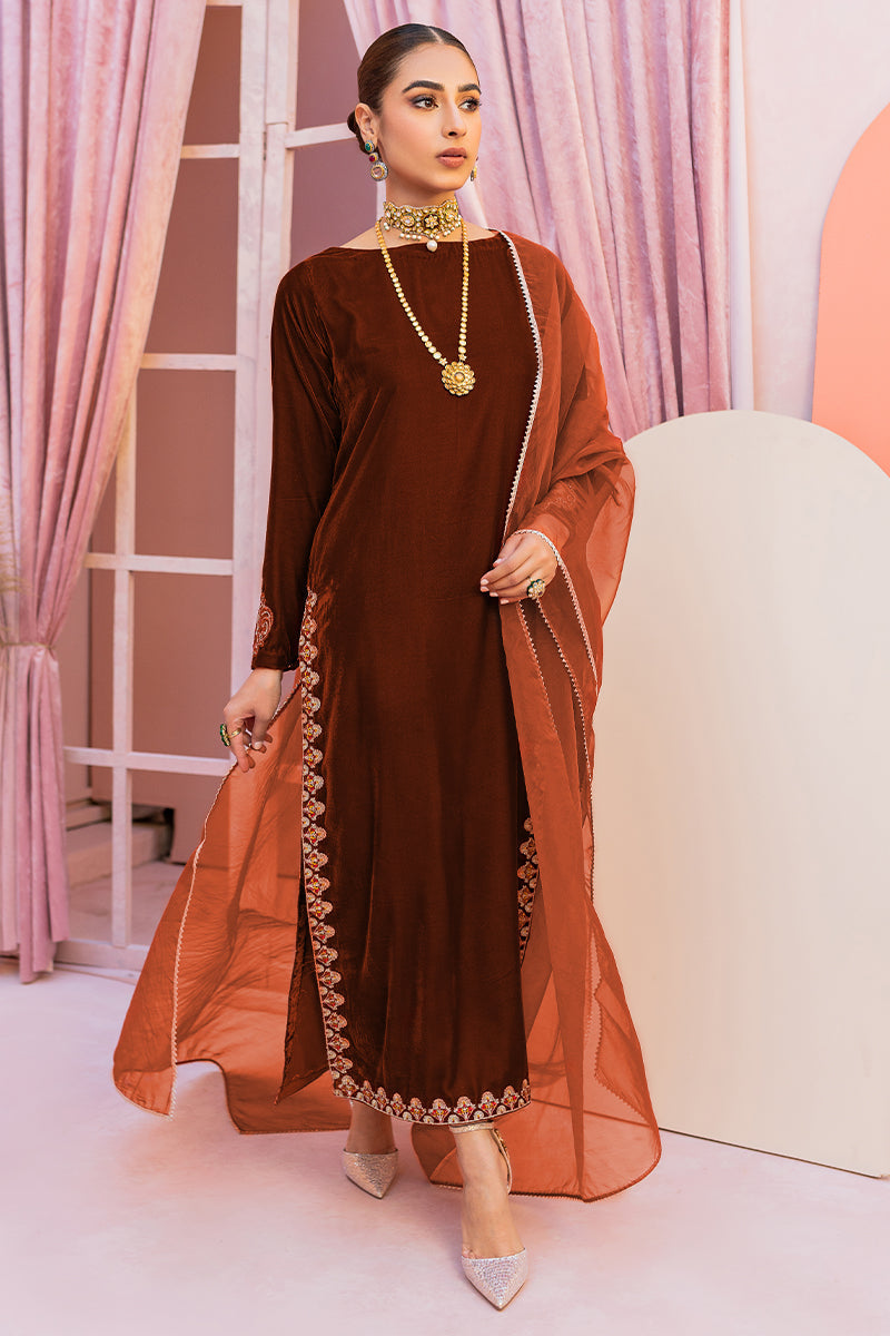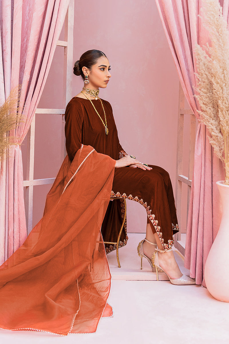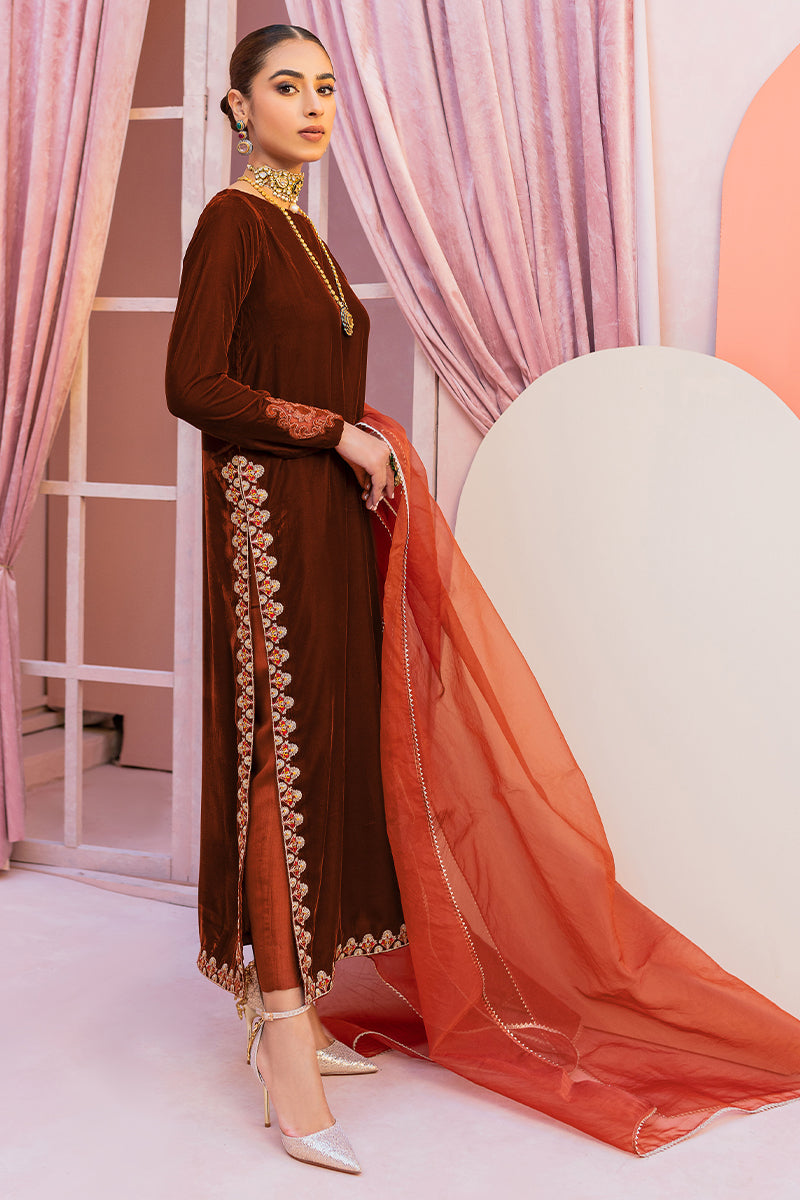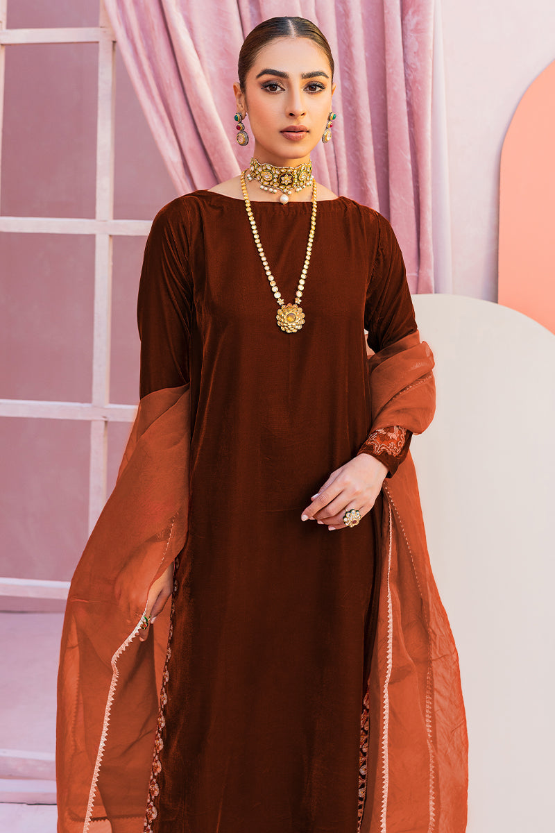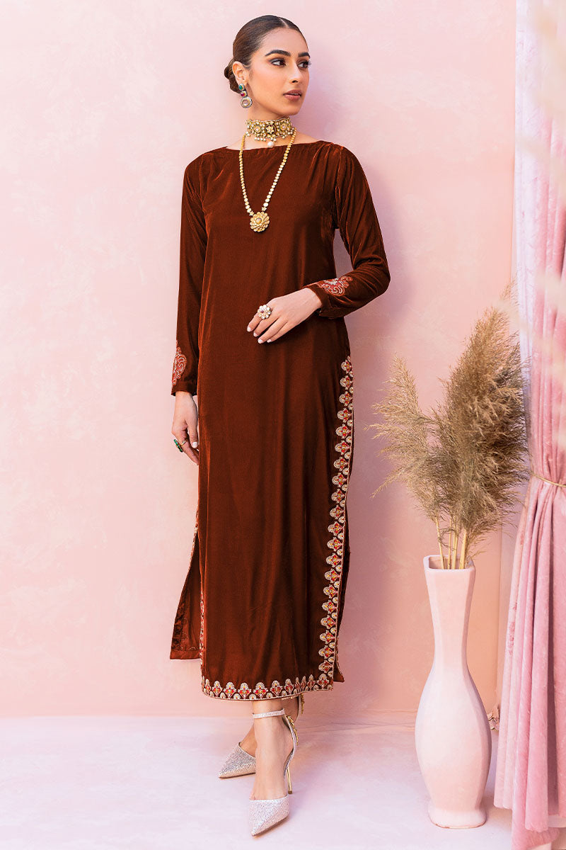 Composed on a velvet canvas is a perfect blend of contemporary attire along with embroideries on the side slits. The straight sleeves are enhanced with an embroidered organza patchwork, layered over straight trousers adding an accent to the overall outfit.