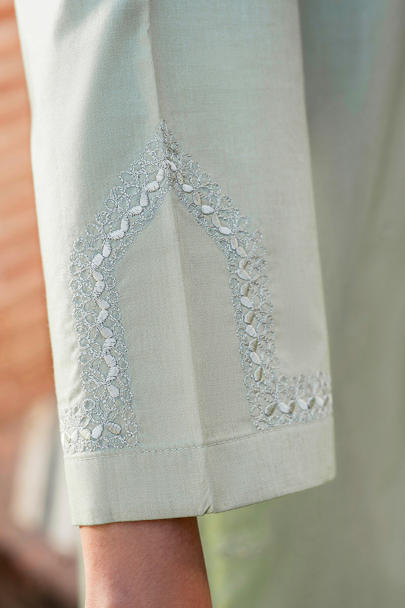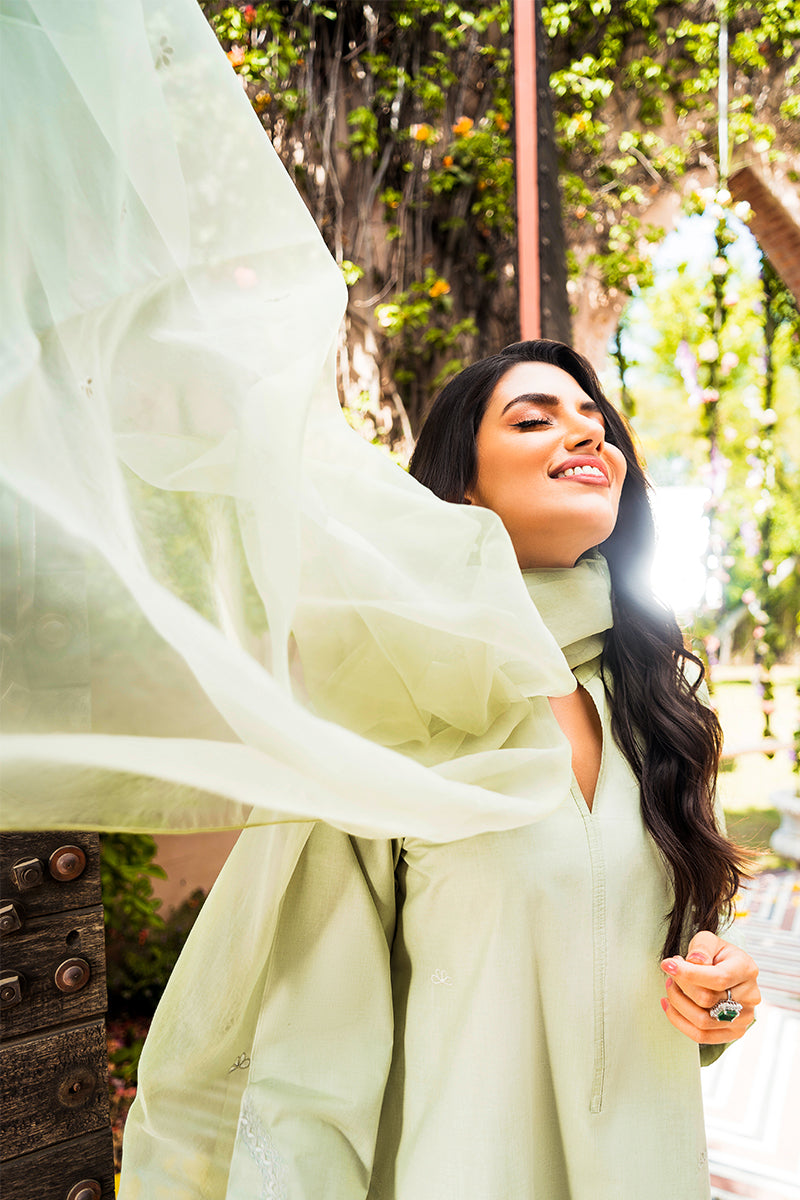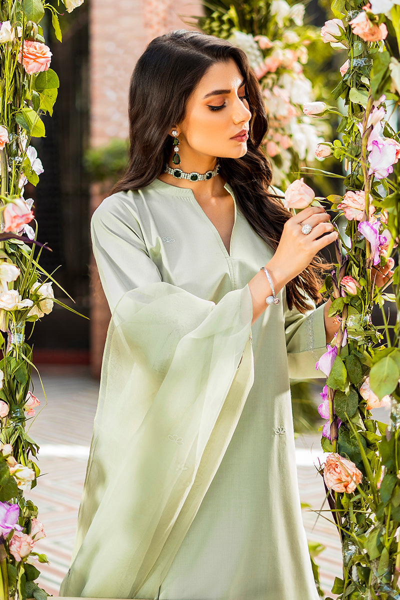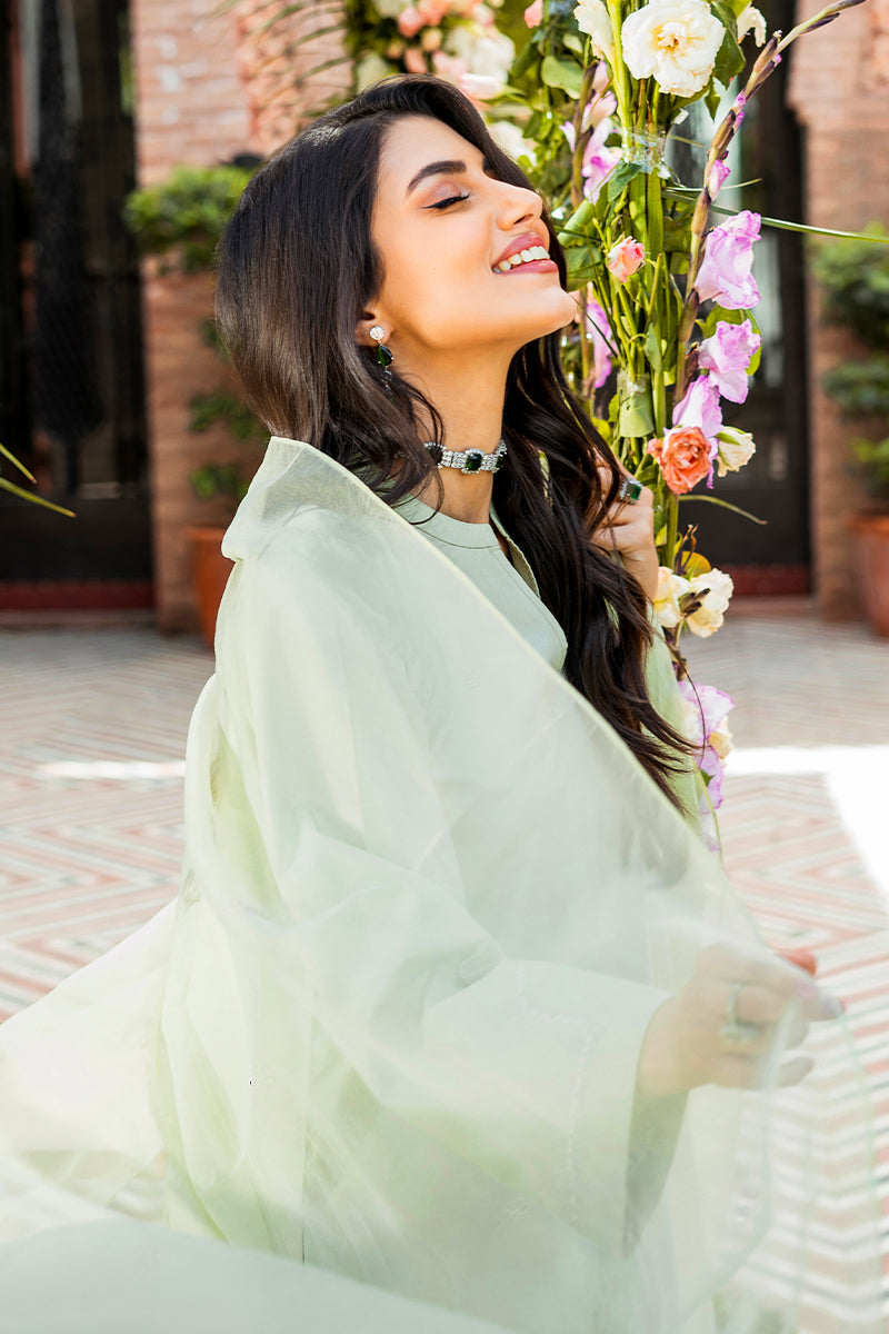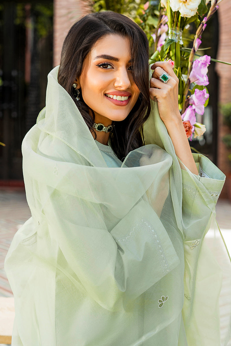 This elongated Mint green silhouette is set off with stunning embroideries in shades of ivory and tilla.