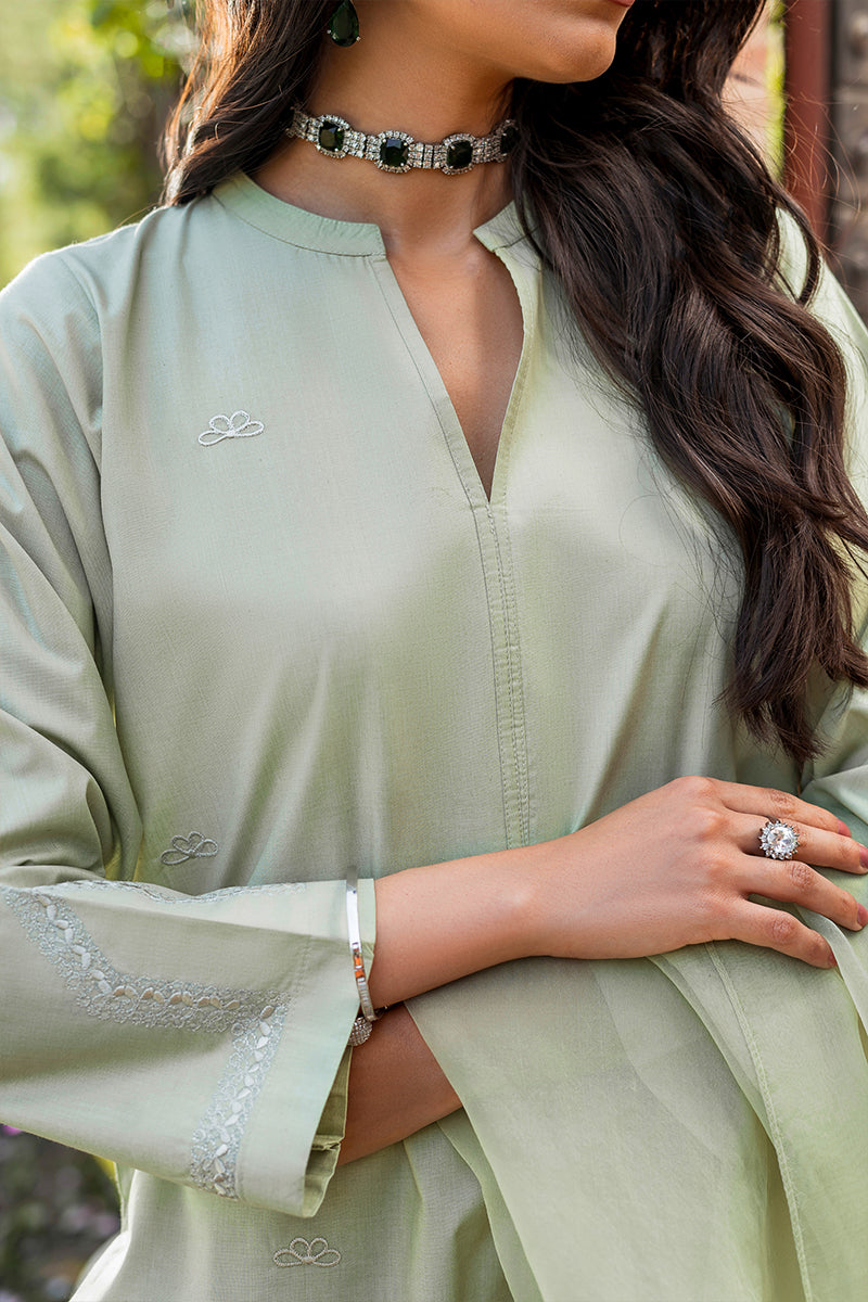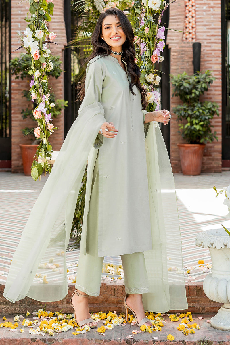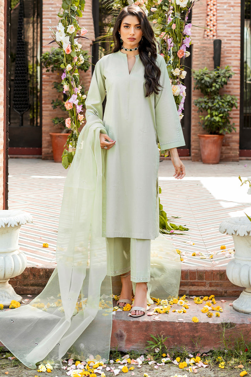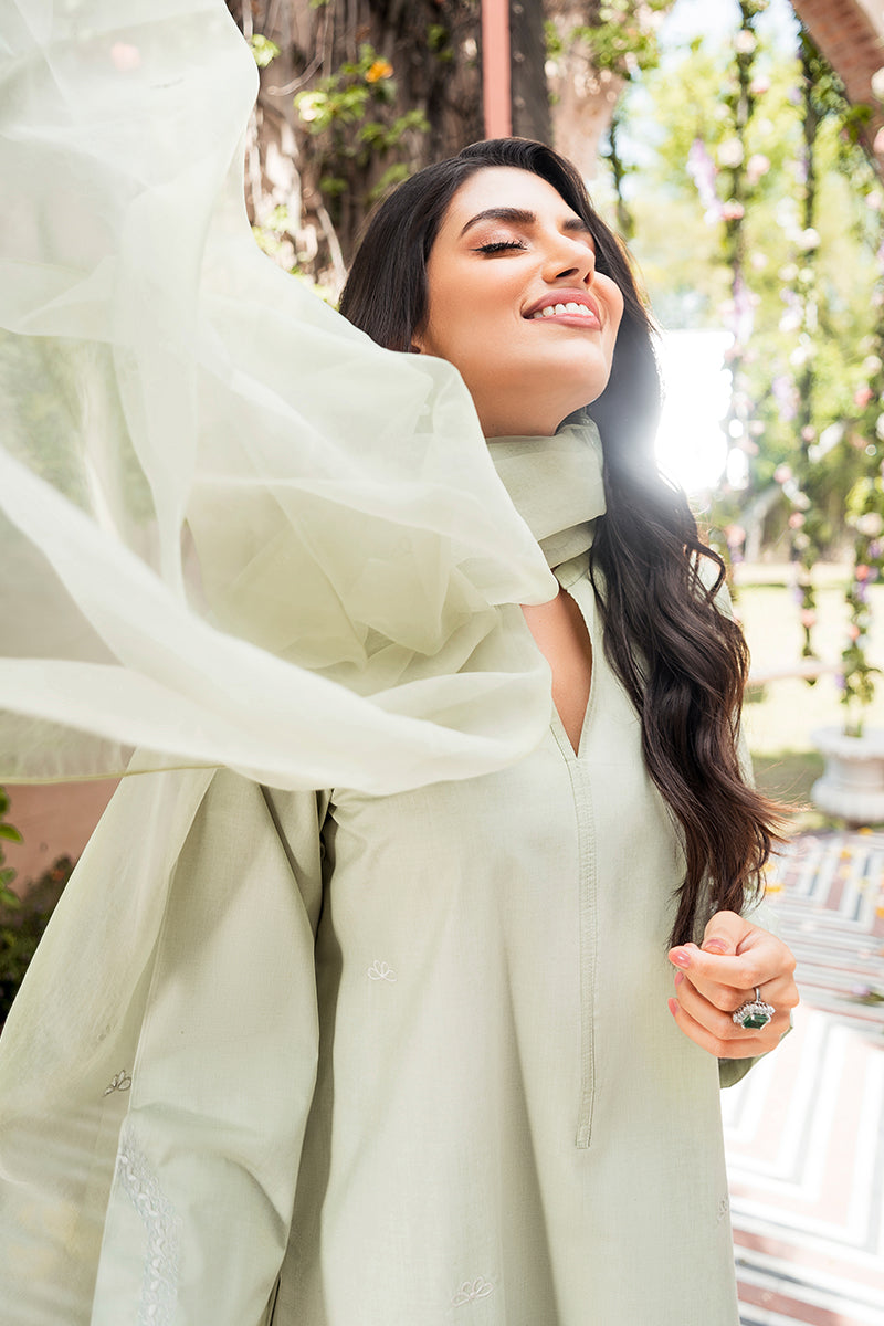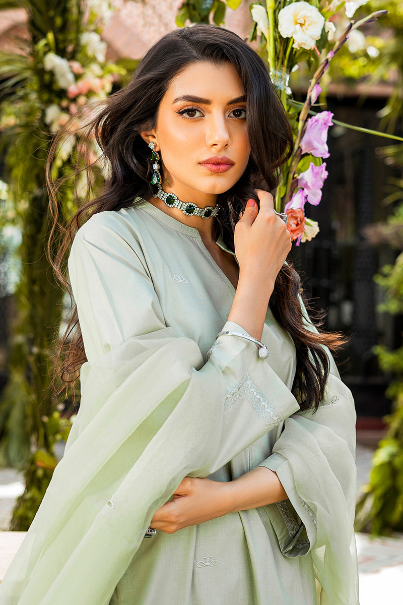 This elongated Mint green silhouette is set off with stunning embroideries in shades of ivory and tilla.