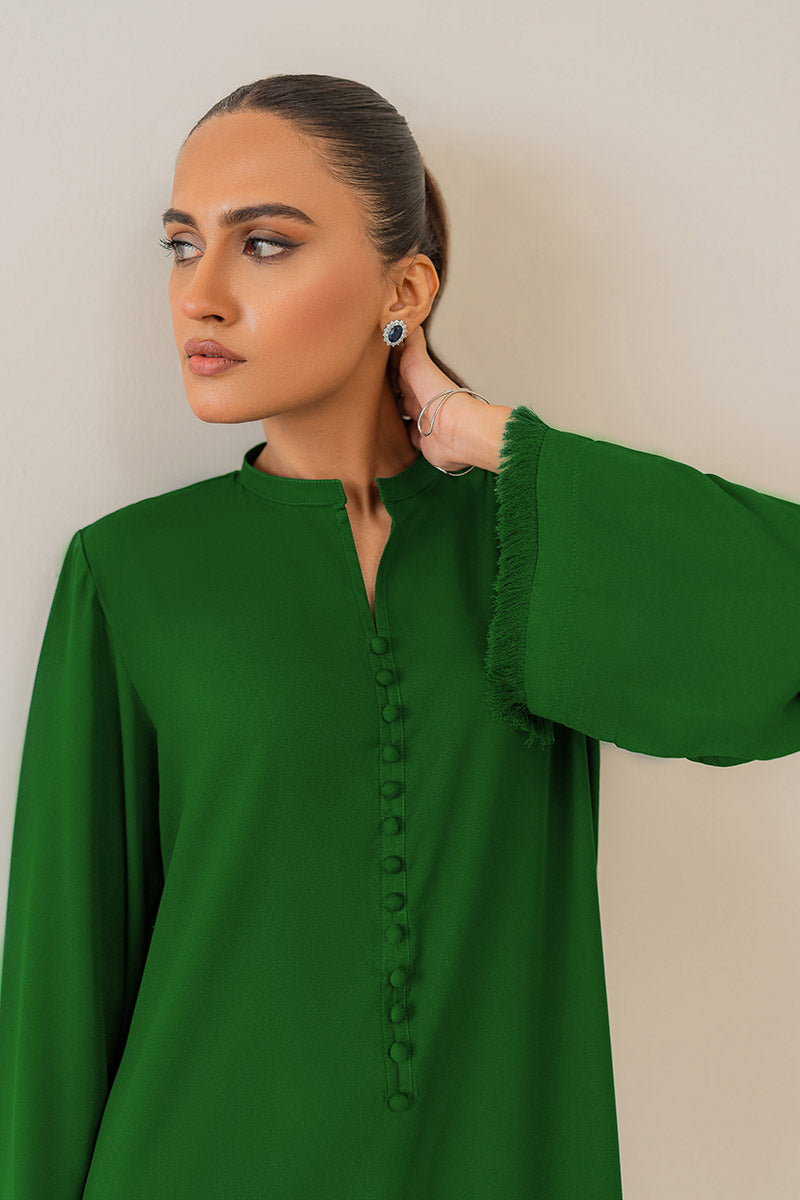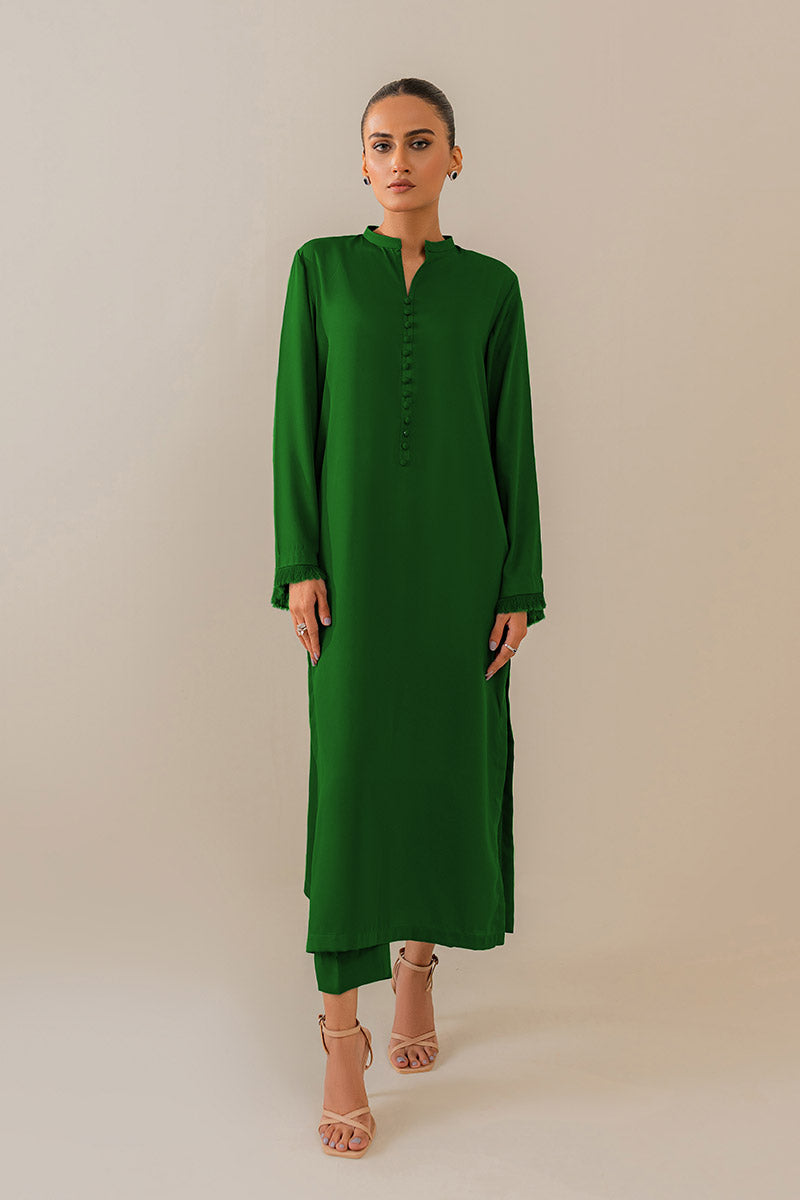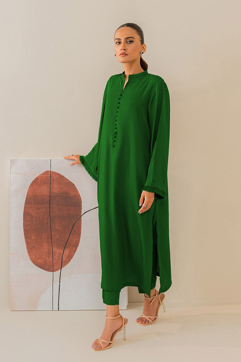 Zenara - a stylish two-piece outfit. Adorned with fashionable loop buttons and subtle frayed edges, this ensemble effortlessly combines relaxed comfort with a touch of luxury. It comes perfectly matched with straight trousers for an easy and coordinated look.