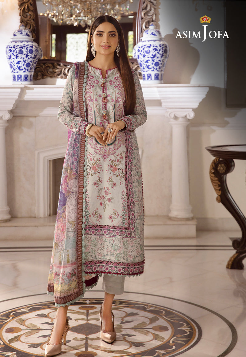 Enter a minty garden of delight with the ASRA collection, embraced by the captivating Saboor Aly. This ensemble, bathed in the refreshing mint green shade, is a floral sanctuary of style. The shirt is a bouquet of blooms, each blossom a stroke of elegance. Paired with a printed chiffon dupatta, as if painted with watercolors, you become a muse of nature's whispering florals.