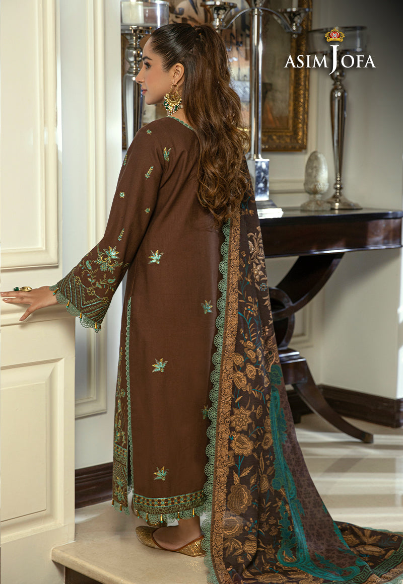 Asra - Winter Shawl Collection unveils the one of the elegant ensembles, a breathtaking fusion of nature and artistry. This elegant brown attire complemented by a khaddar shawl is the embodiment of winter's warmth and grace. This earth-toned outfit is adorned with intricate zariwork and threadwork inspired by traditional designs, this embroidery pays homage to the rich heritage and craftsmanship of our region. The khaddar shawl features a mesmerizing paisley motif in a lush teal hue, intertwined with golden accents creating a mesmerizing contrast, much like the vivid tapestry of nature in winter