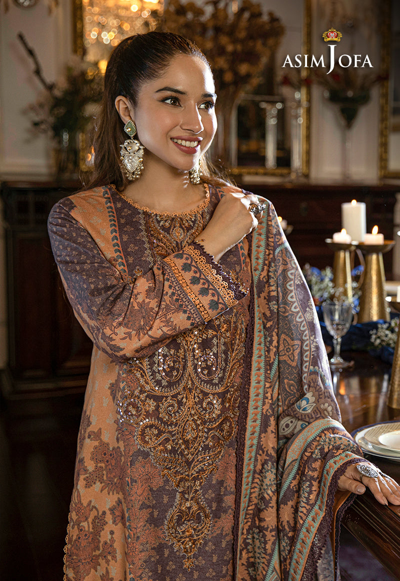 Unveil sophistication with this ensemble, a dark peach design accented with rich brown tones. The printed shirt is adorned with intricate motifs of floral and geometric patterns, is a testament to meticulous detailing. With a embroidered round neckline, full sleeves, and a subtly flared hemline, the shirt exudes understated elegance. The karandi shawl is crafted from a beautiful fabric adding a dash of flair. It's a statement of refined style that leaves a lasting impression.