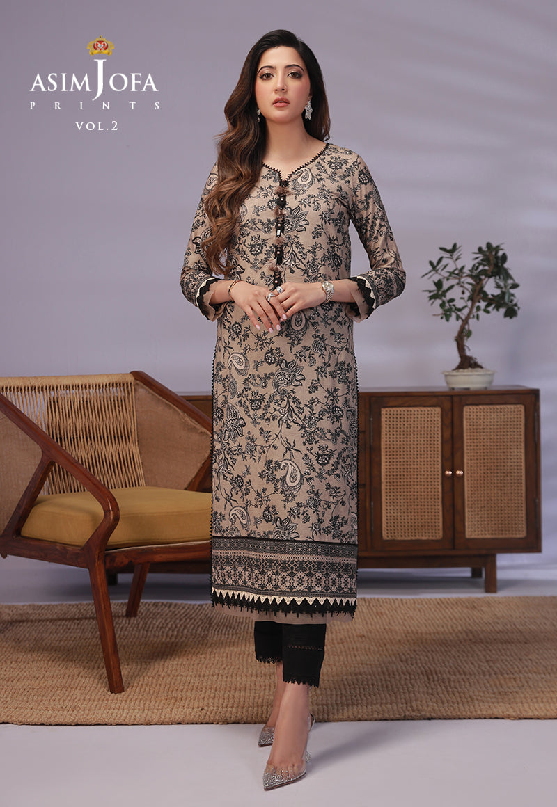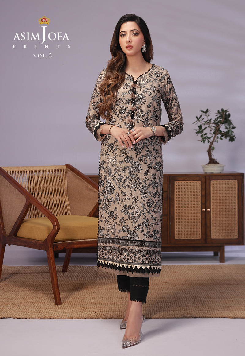 As if painted by the hands of a master artist, this design brings together black floral paisley motifs in a breathtaking display upon a canvas of alluring taupe. The digitally printed lawn shirt becomes a gallery of sophistication, where each stroke of artistry evokes admiration. Embrace the captivating allure of taupe and black with ‘Asim Jofa Prints’.