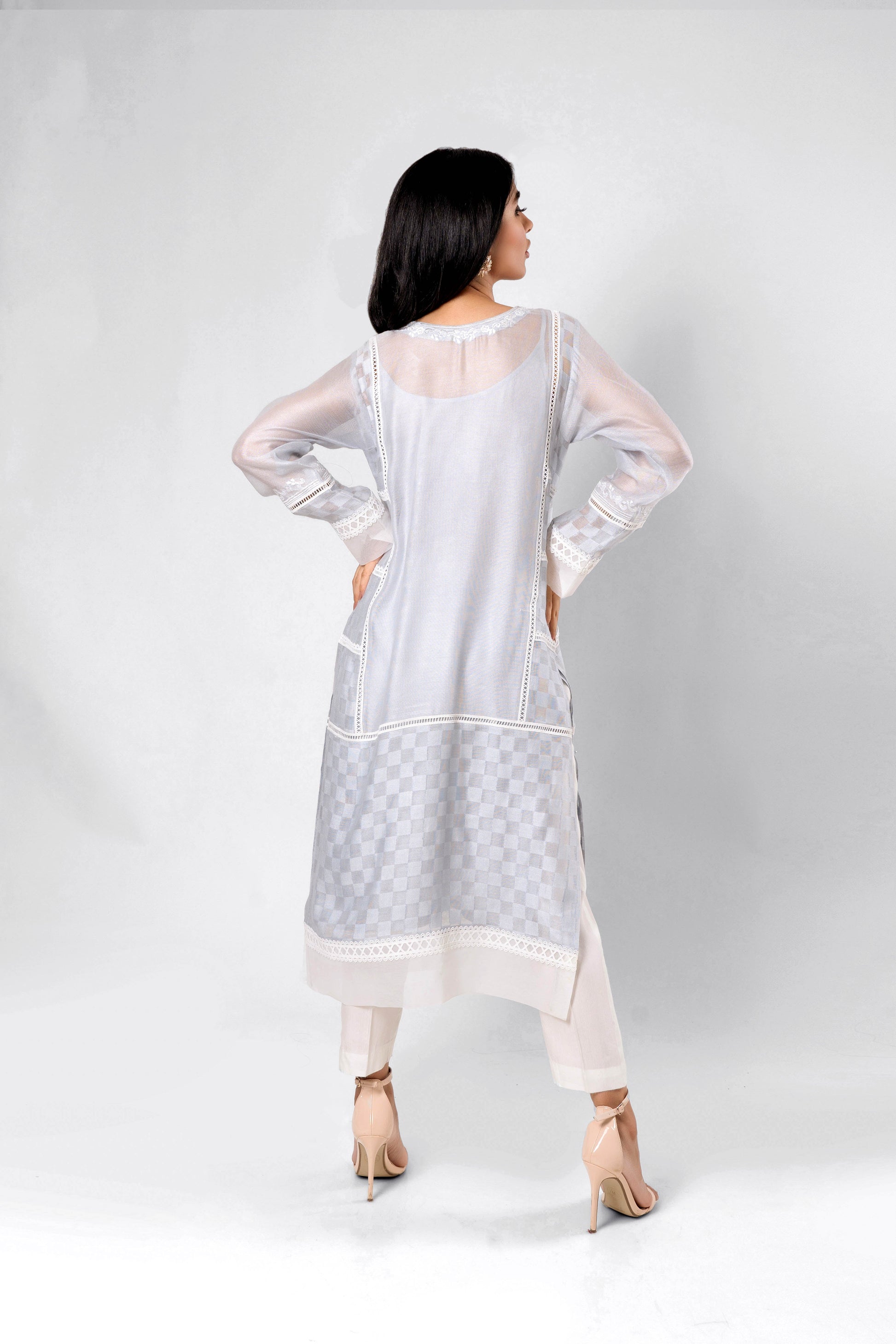 Pale dusty blue khaddi net ensemble detailed with embroidery, pearls and laces. Comes with a block printed khaddi net dupatta with lace and organza finishing.