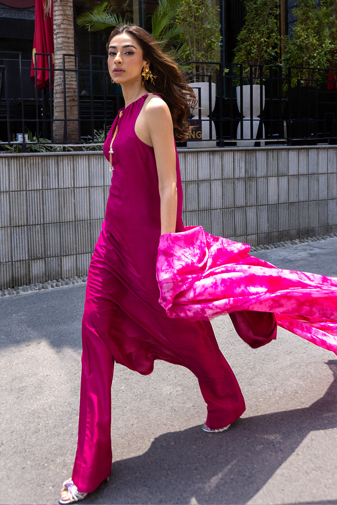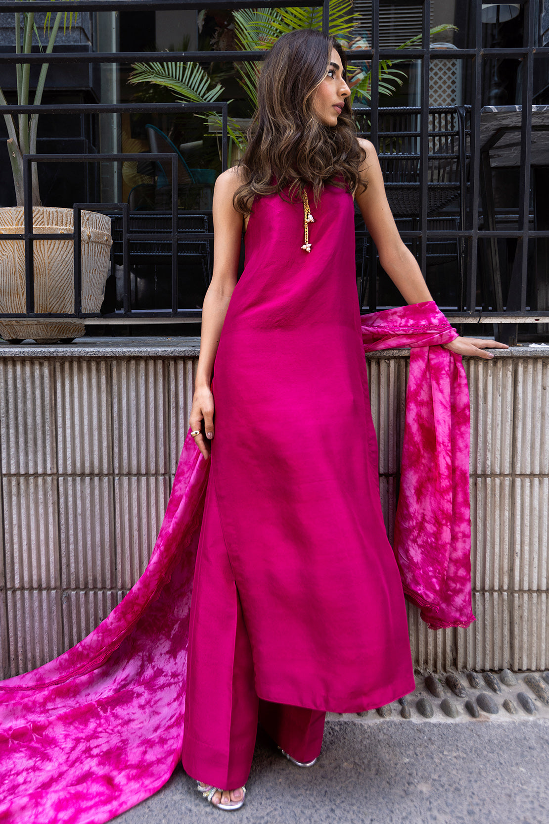 The vibrant fuchsia pink colour is an essential piece to have in your wardrobe. Made on pure raw silk with details of chain rope and pearls ads a chic element to the cutline. Paired with same-coloured boot cut pants and tie and die dupatta to complete the look.